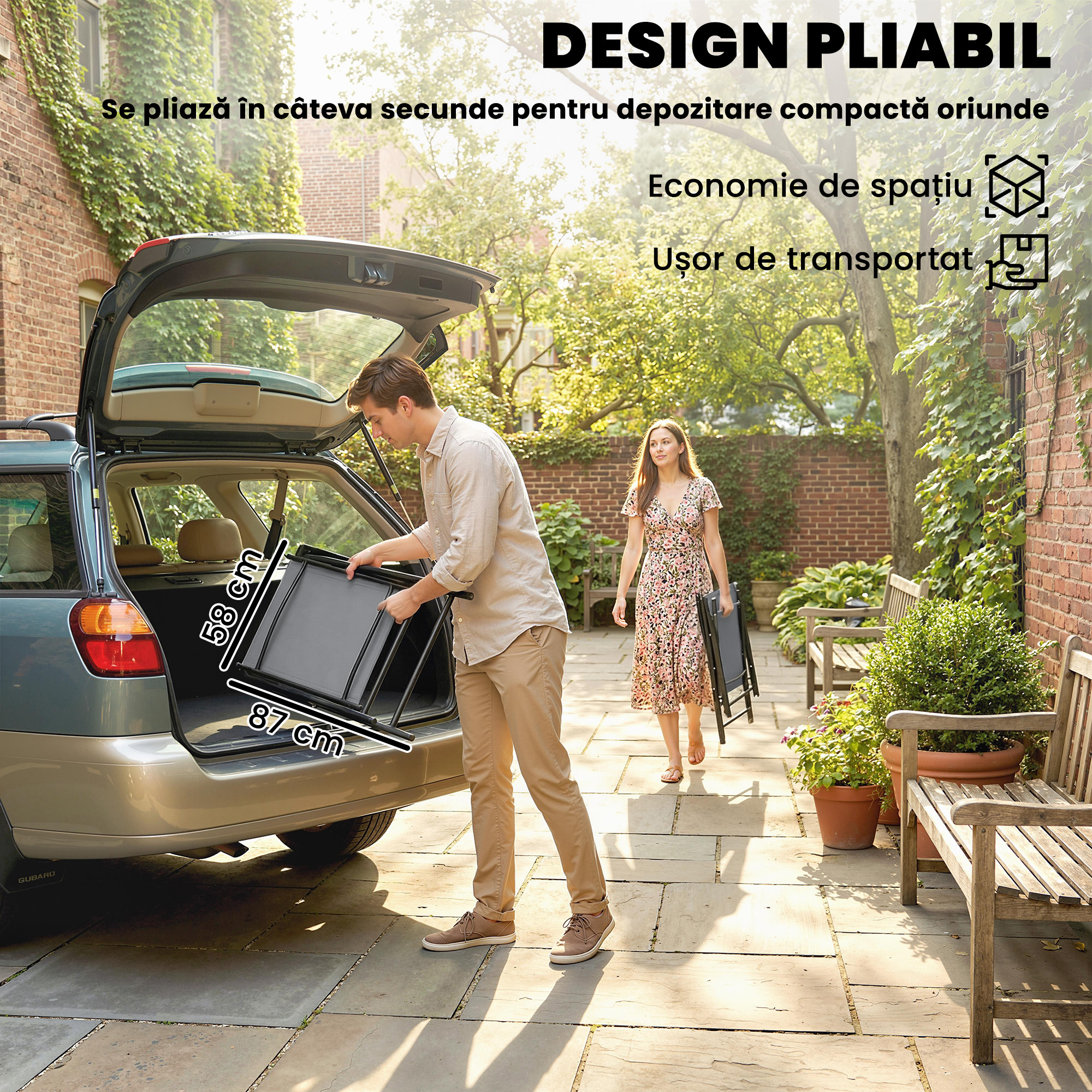 Scaunele de gradina pliabile [BRAND NAME] ofera confort si rezistenta la intemperii, evitand pozitiile incomode sau dezordonate. Cu un spatar inalt, brate curbate si tesatura robusta din Texteline, acestea garanteaza relaxare pentru fiecare oaspete. Perfecte pentru a crea o atmosfera primitoare in timpul evenimentelor pe terasa sau in gradina, reprezinta solutia ideala pentru intalniri in aer liber, chiar si in caz de ploi neasteptate.