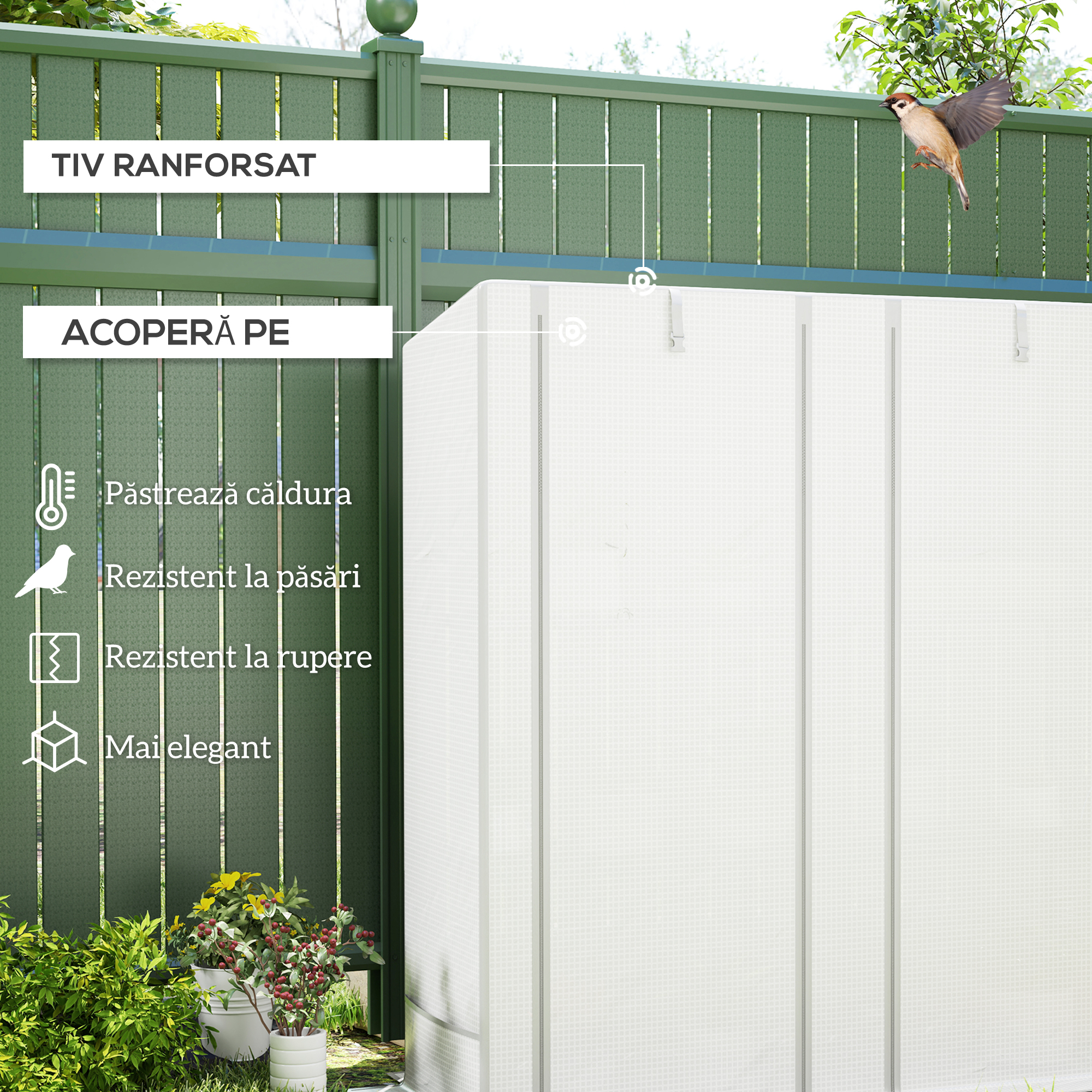 • • Acoperire din plastic de 140 g/m² care protejeaza de intemperii usoare, cu usi cu fermoar pentru acces facil si ventilatie