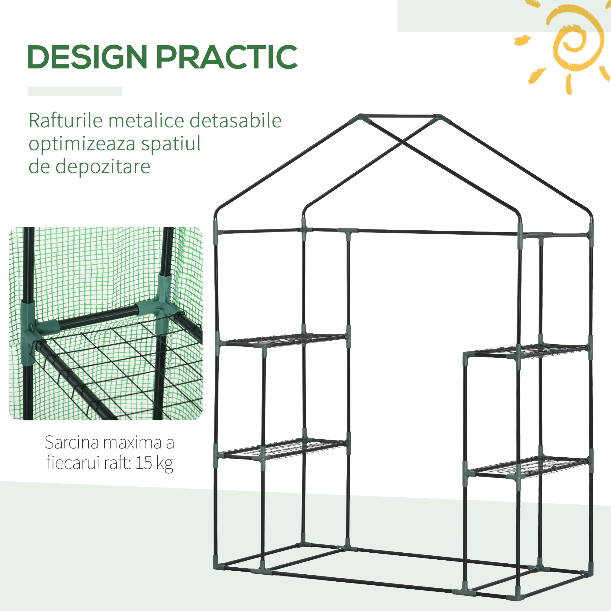 Aceasta sera de gradina [BRAND NAME] va va permite sa cultivati orice doriti, protejand in acelasi timp plantele de vremea rea, de pasari si de daunatori. Dispune de un cadru stabil din otel, in timp ce copertina din PE creeaza protectia potrivita pentru a retine caldura necesara si pentru a proteja structura de vant si ploaie. Usa rulanta a serei mici va permite sa intrati si sa iesiti pentru a patrunde in interior in orice moment.