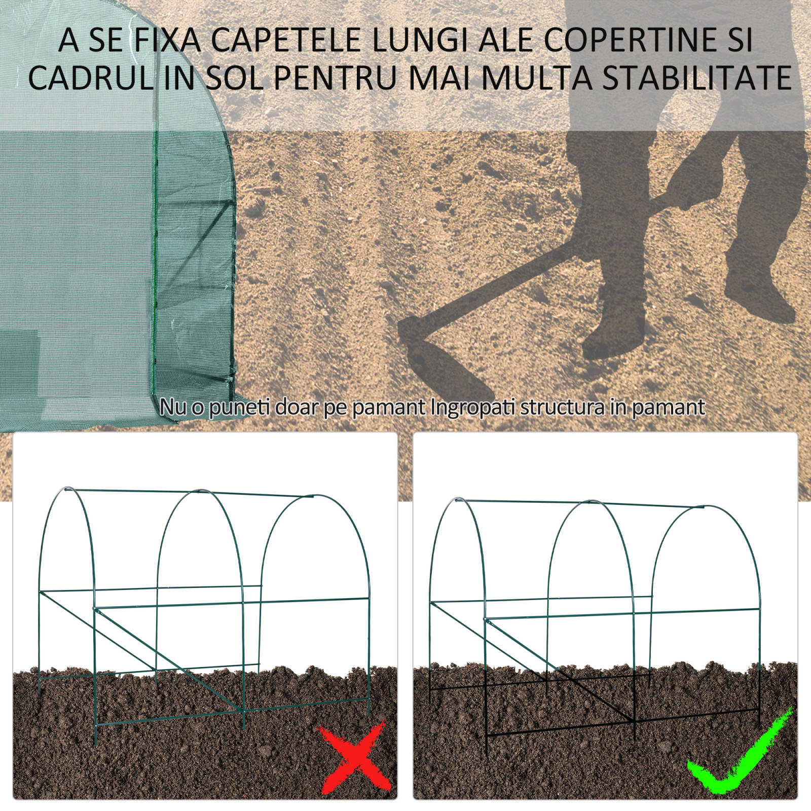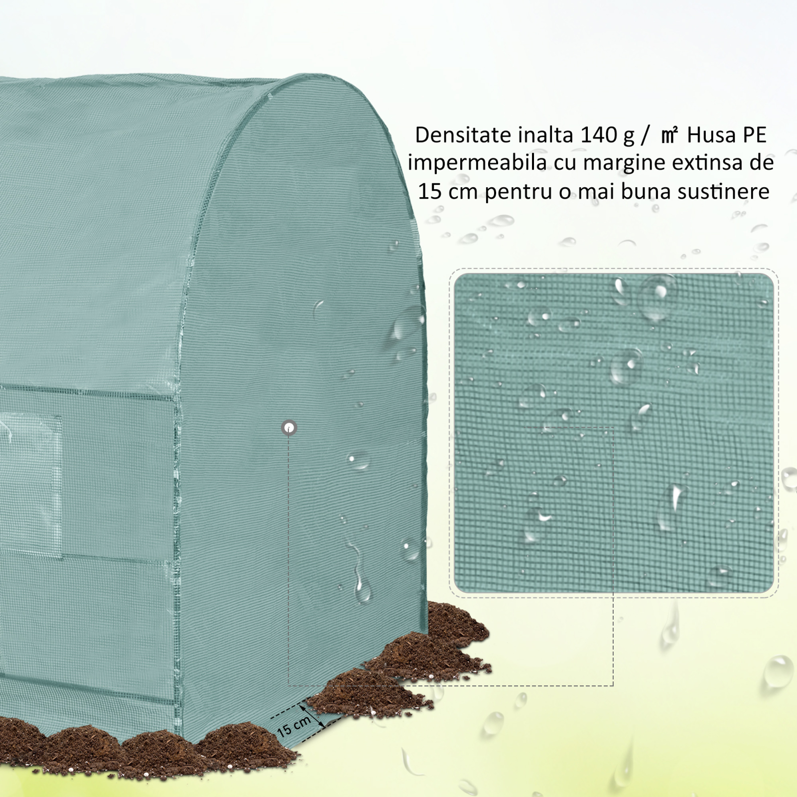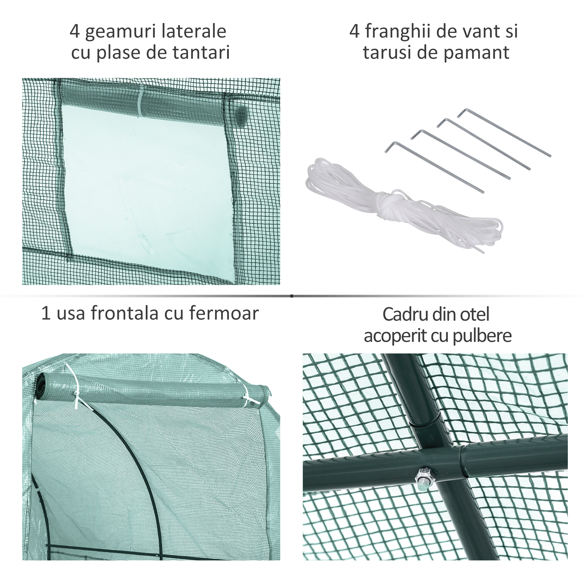 Aceasta [BRAND NAME] sera de gradina din PE,245x200x198cm verde este o sera stabila de gradina PE cu cadru din otel, usor si rapid de instalat, care va protejeaza plantele de frig, ploaie, grindina, vant si lumina soarelui intensa. [BRAND NAME] sera de gradina din PE, 245x200x198cm, verde se prezinta sub forma unui constructii de tip tunel, rezistenta si solida, din otel acoperit cu pulbere.