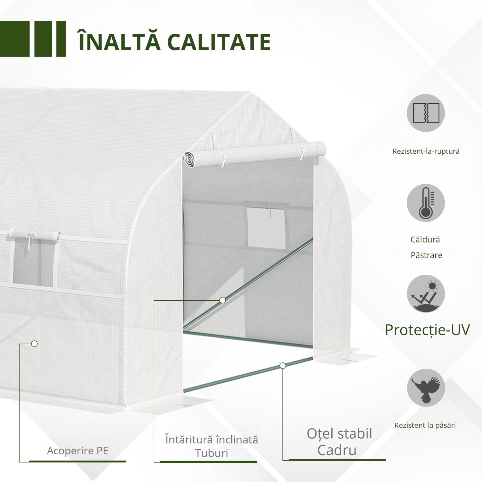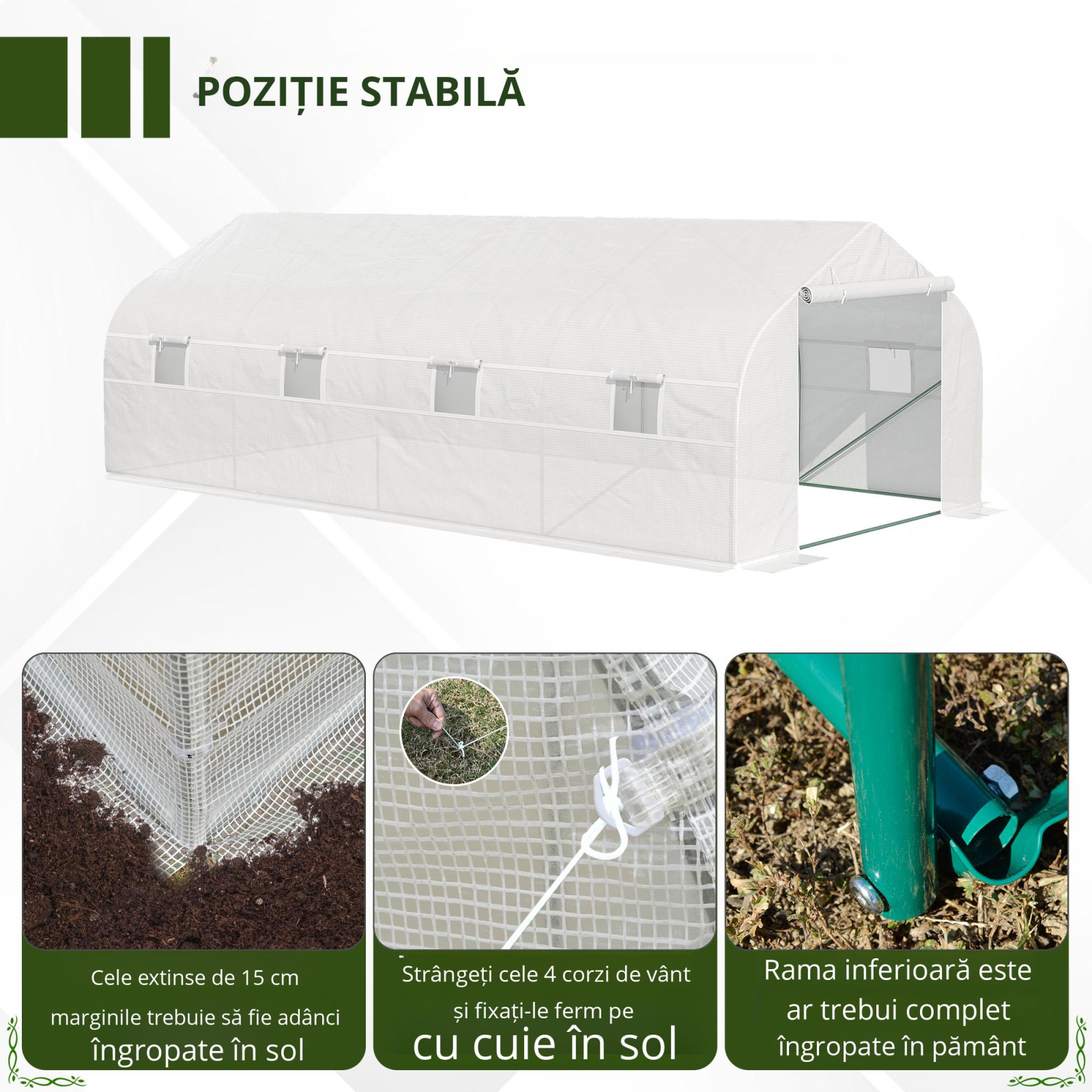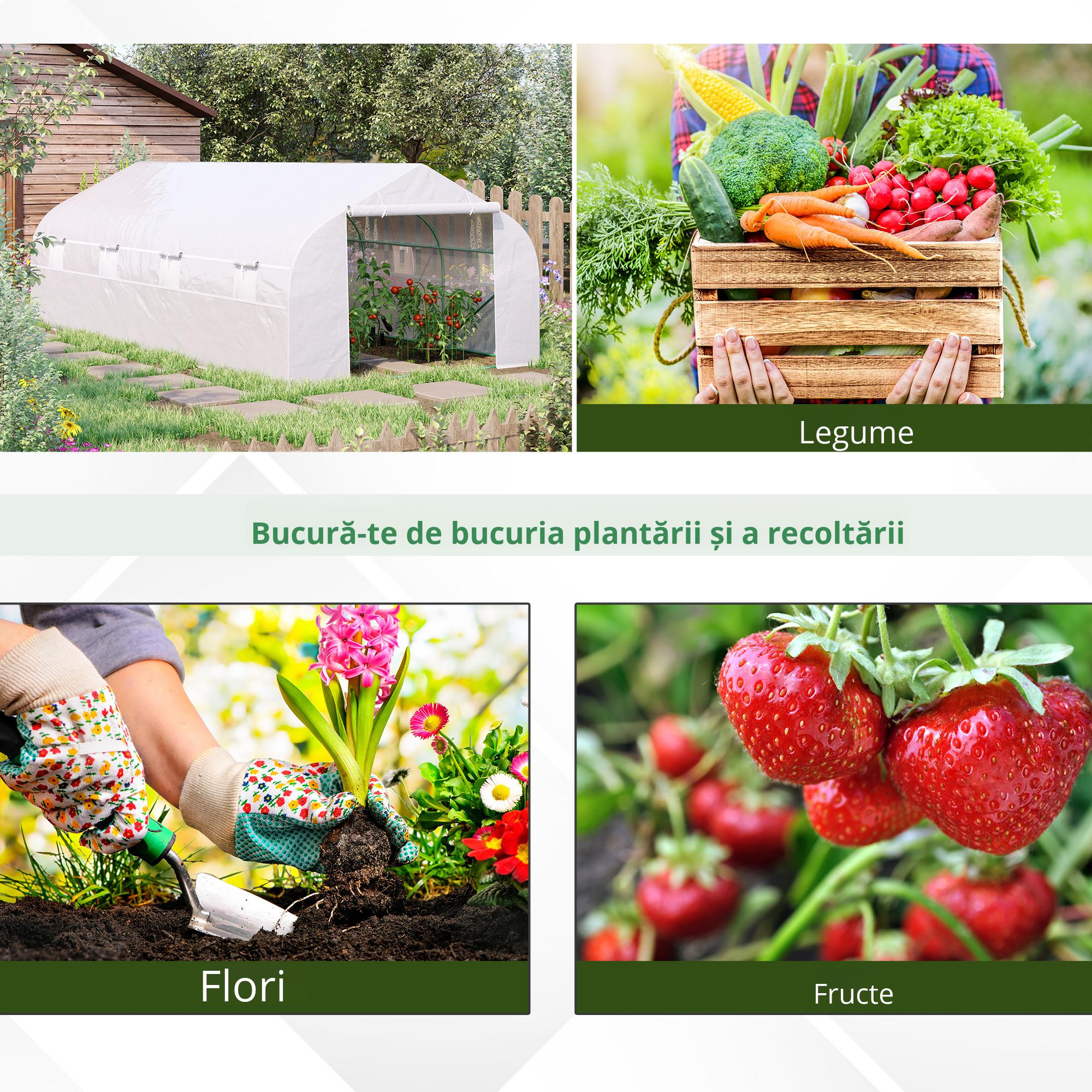 Aceasta sera [BRAND NAME] este perfecta pentru a va cultiva plantele pe tot parcursul anului. Structura din teava de otel garanteaza stabilitate chiar si pe vreme rea, fiind sustinuta in sol si prin cei 4 tarusi si cele 4 franghii incluse in pachet. Copertina durabila din plastic PE protejeaza plantele pe tot parcursul anului, permitand totusi trecerea luminii soarelui. In fine, cele 8 ferestre si usa rulanta cu fermoar garanteaza o ventilatie excelenta a aerului.