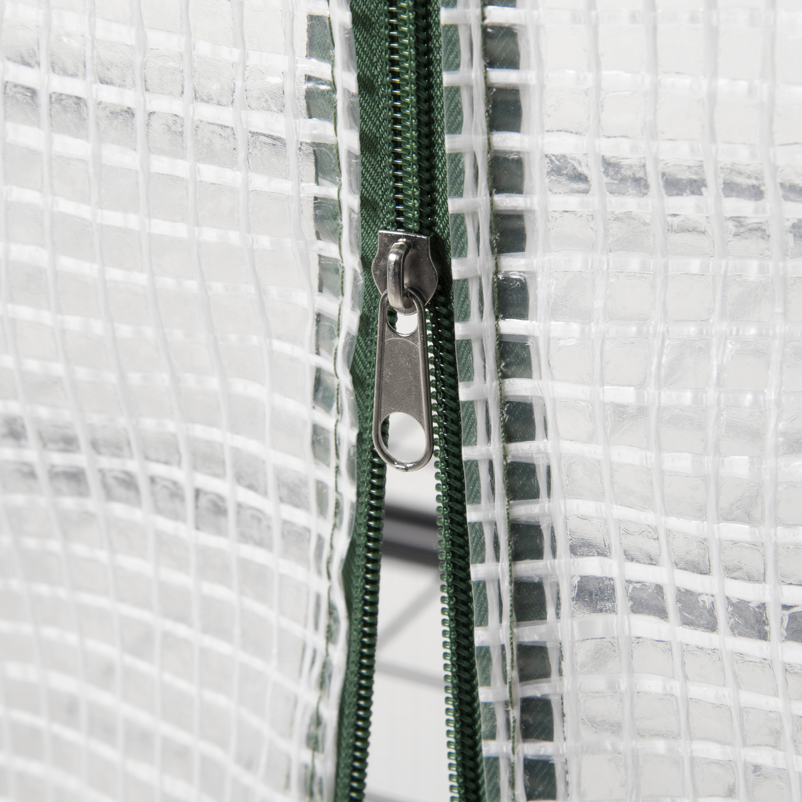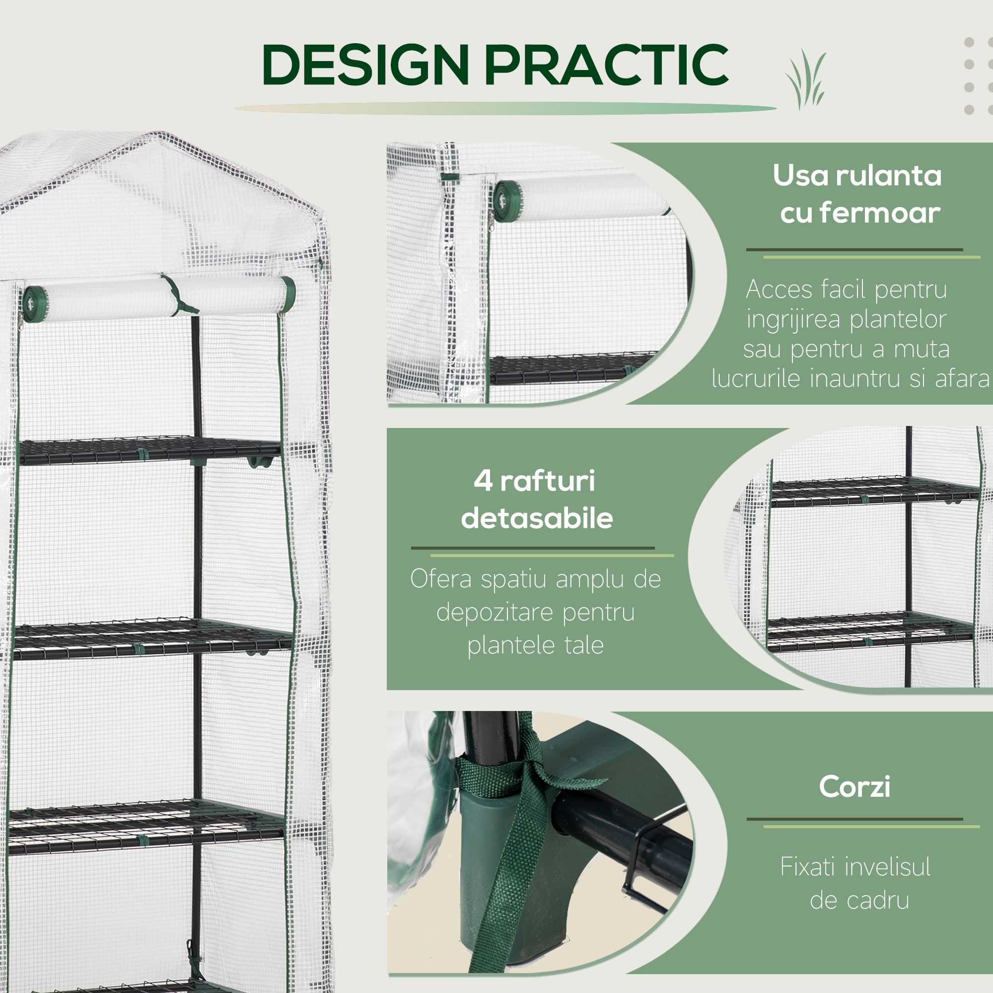 Aceasta sera verticala [BRAND NAME] cu designul sau compact este solutia perfecta pentru cei care doresc sa-si protejeze plantele chiar si in spatii mici, precum balcoane sau terase. Are un cadru robust din otel si o acoperire PE care protejeaza plantele de razele UV si asigura in acelasi timp trecerea luminii. Usa rulanta cu fermoar permite accesul usor la zona interioara, iar etajera cu 4 rafturi va permite sa va plasati toate plantele intr-un mod organizat.
