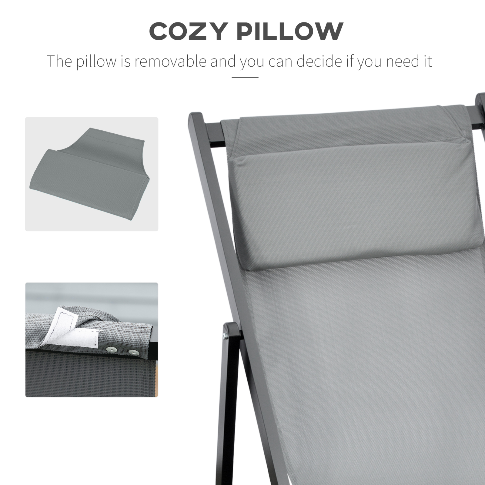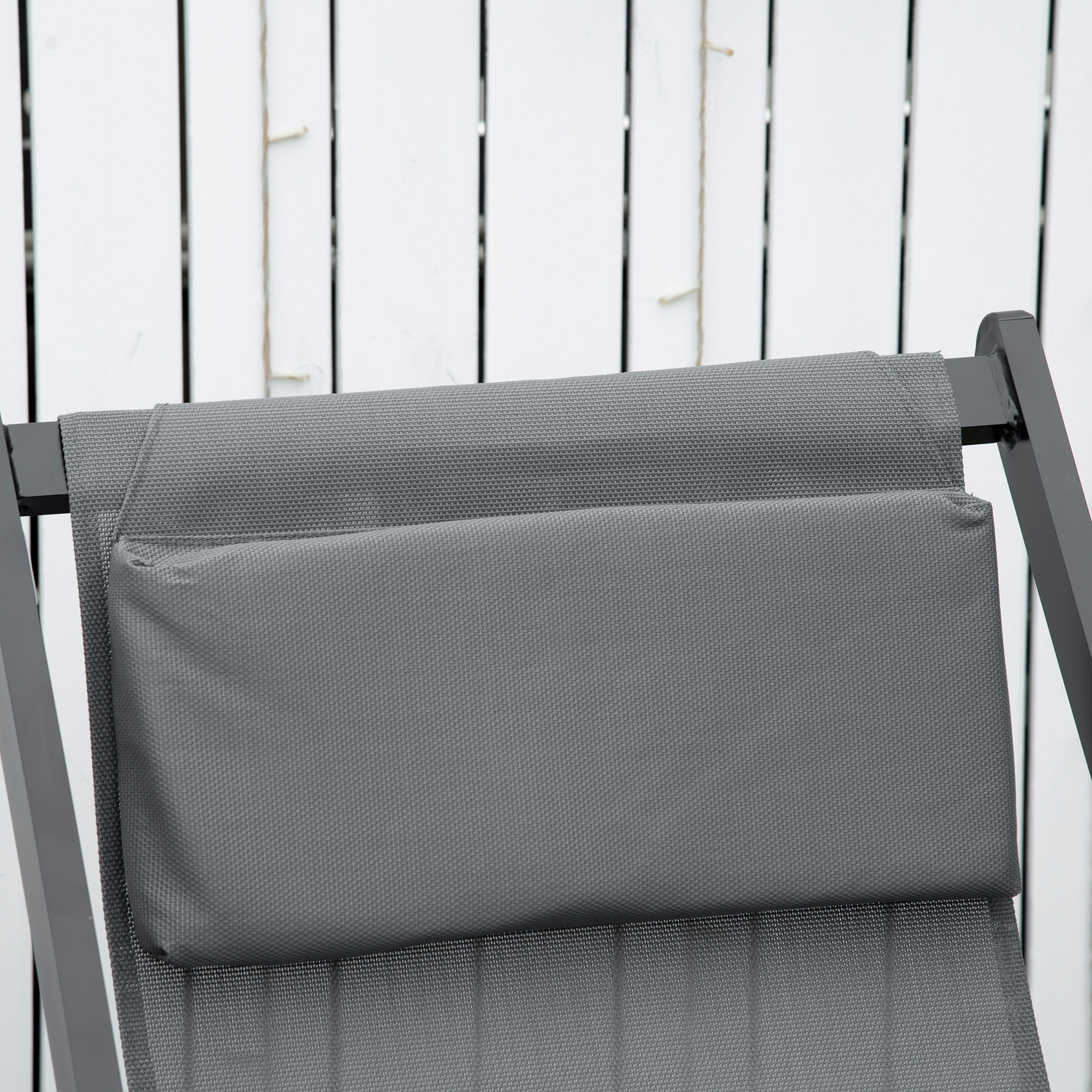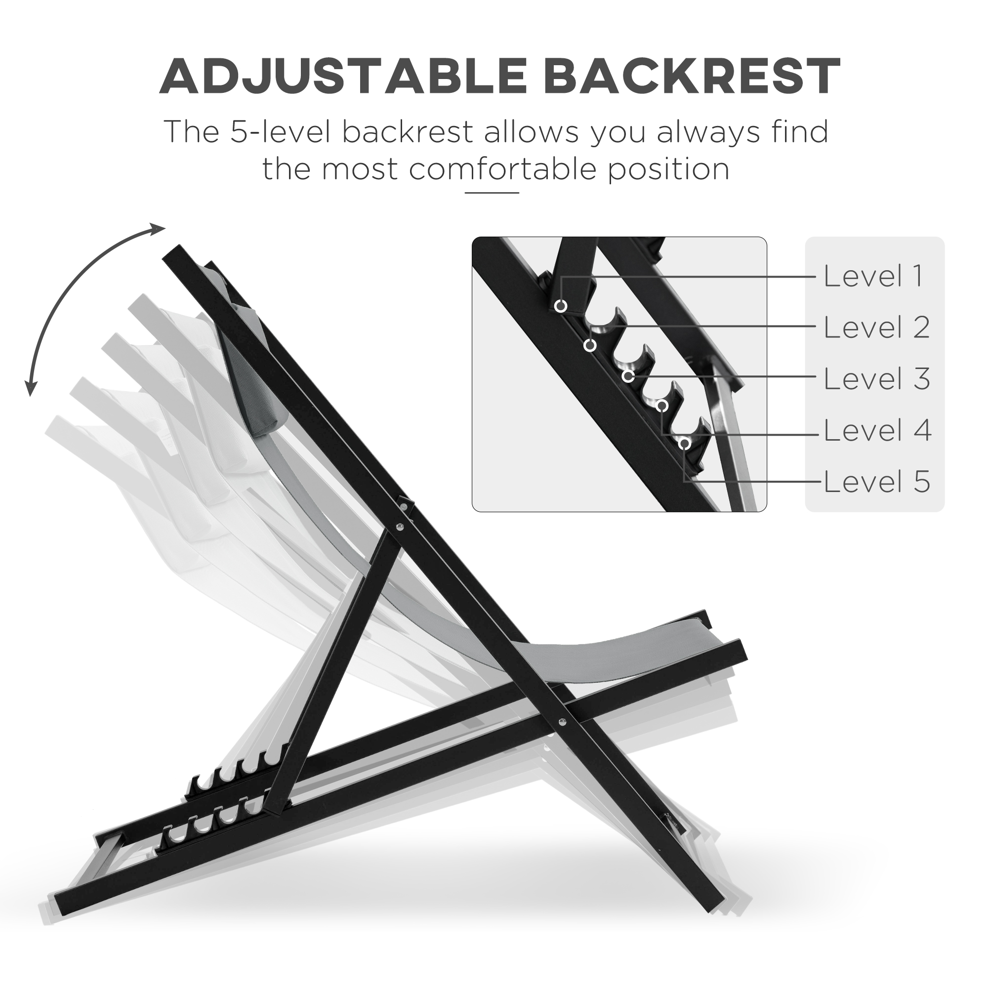 Bucurati-va de relaxare acasa sau la plaja cu acest set fantastic de 2 sezlonguri pliabile de la [BRAND NAME]! Datorita cadrului lor din aluminiu, care este antimucegai si anti-umiditate, si a structurii din textilen impermeabil, sunt perfecte pentru mediile exterioare. Confortul este asigurat datorita spatarului confortabil pe care il puteti regla cu usurinta pe 5 niveluri de inaltime. Ce mai asteptati, aduceti o nota de eleganta pe terasa dvs. cu acest set de 2 sezlonguri!