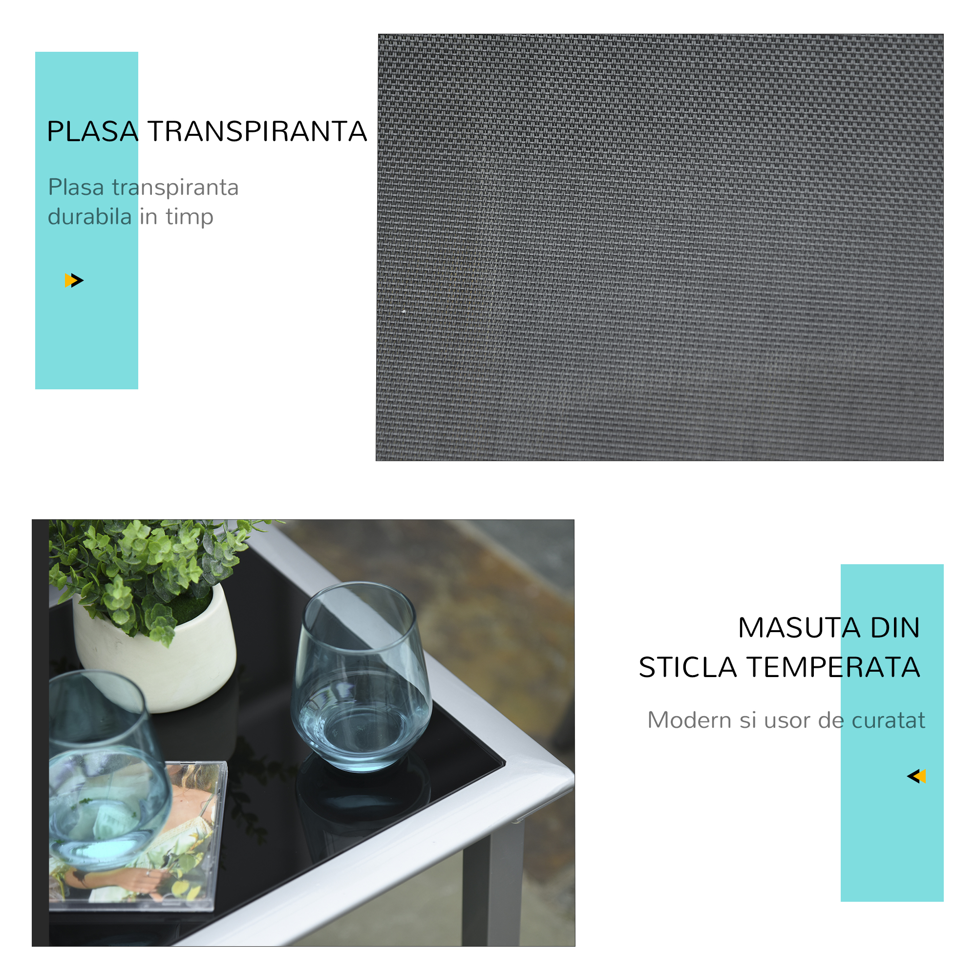 Aduceti o nota de viata in gradina dvs. cu acest set practic de 2 sezlonguri si masuta [BRAND NAME]! Scaunele de gradina sunt realizate cu o structura metalica solida si tesatura respirabila pentru a va oferi rezistenta si confort in timp. Masa practica de gradina aduce un plus de eleganta gratie raftului din sticla. Nu ratati!