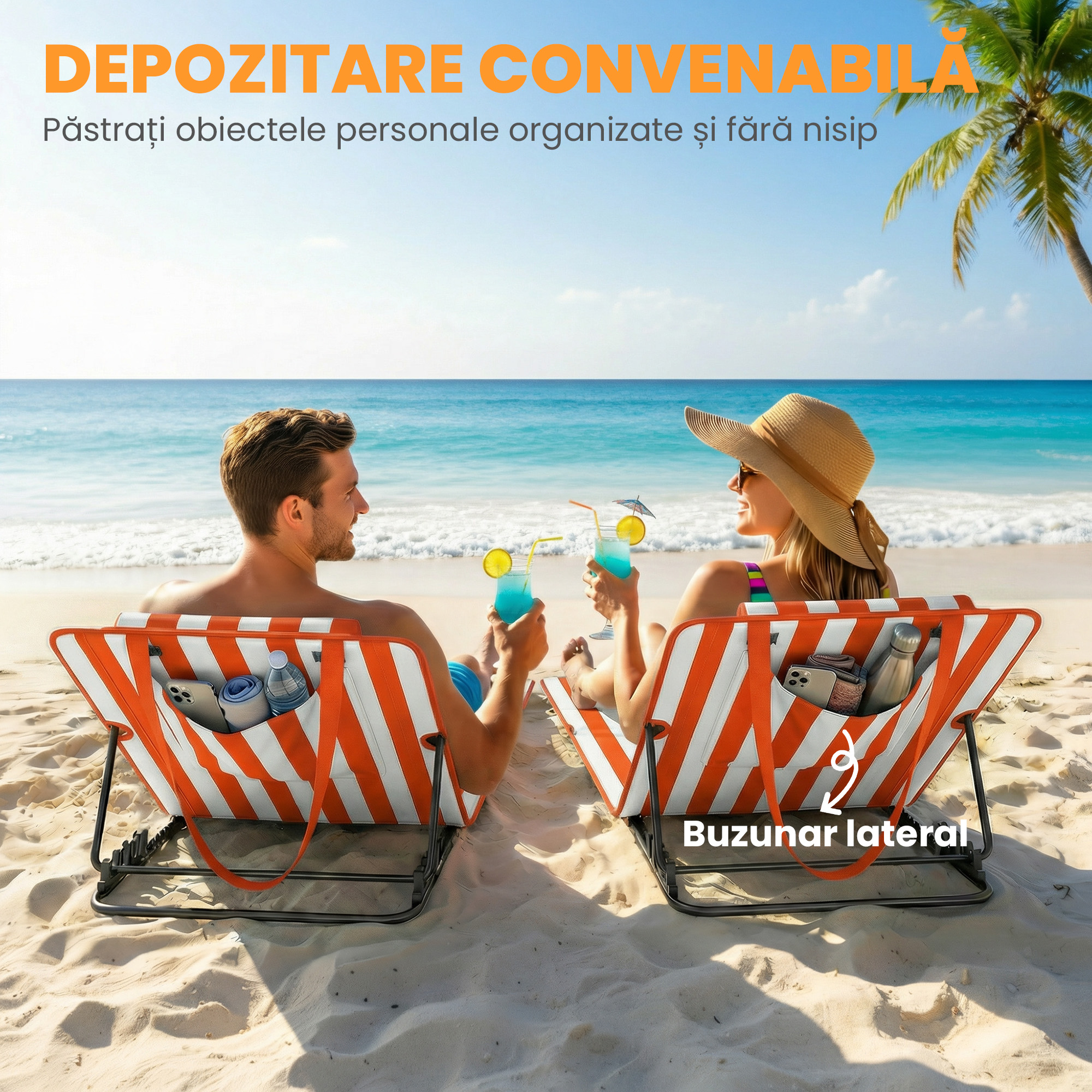 Satul de scaunele incomode pentru zilele petrecute in aer liber? Setul [BRAND NAME] cu 2 sezlonguri de plaja pliabile, usor si simplu de transportat, este ideal pentru doua persoane. Cu spatar reglabil in patru pozitii, ofera confort si relaxare comuna, transformand zilele tale la plaja in momente placute si fara efort.