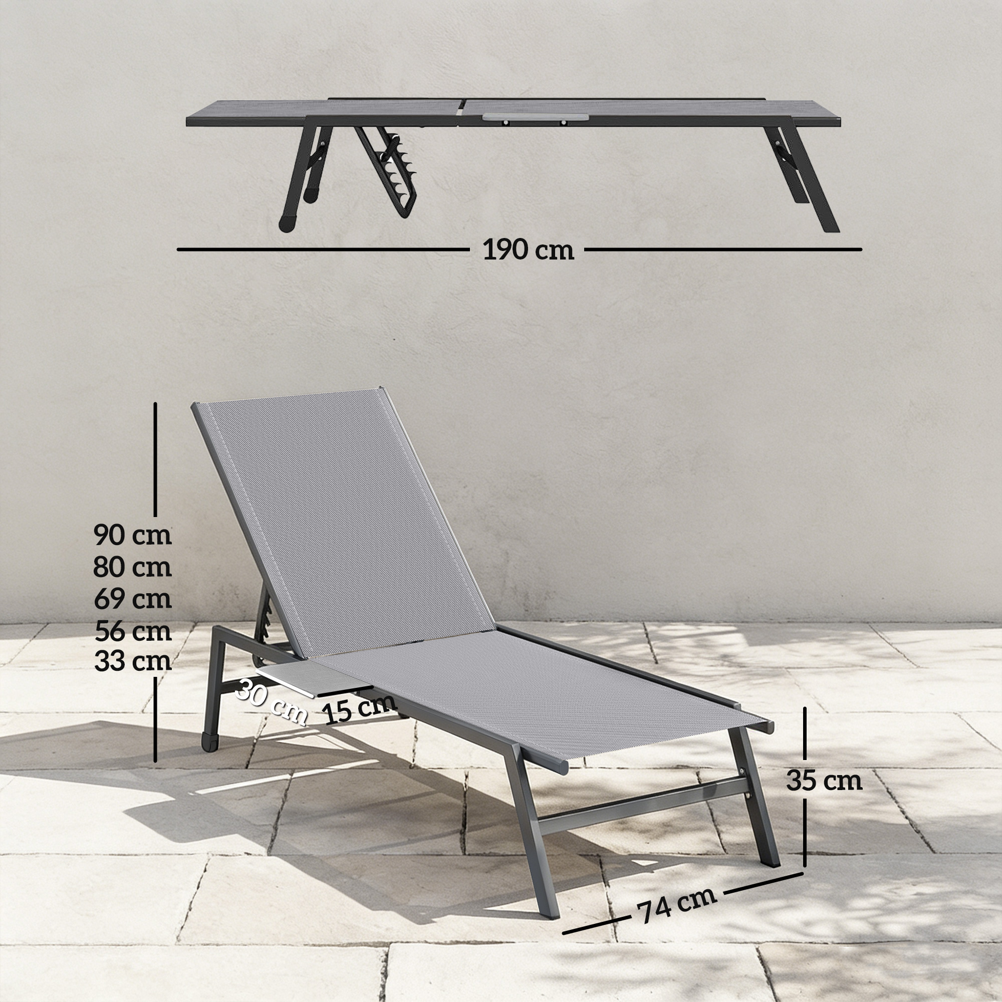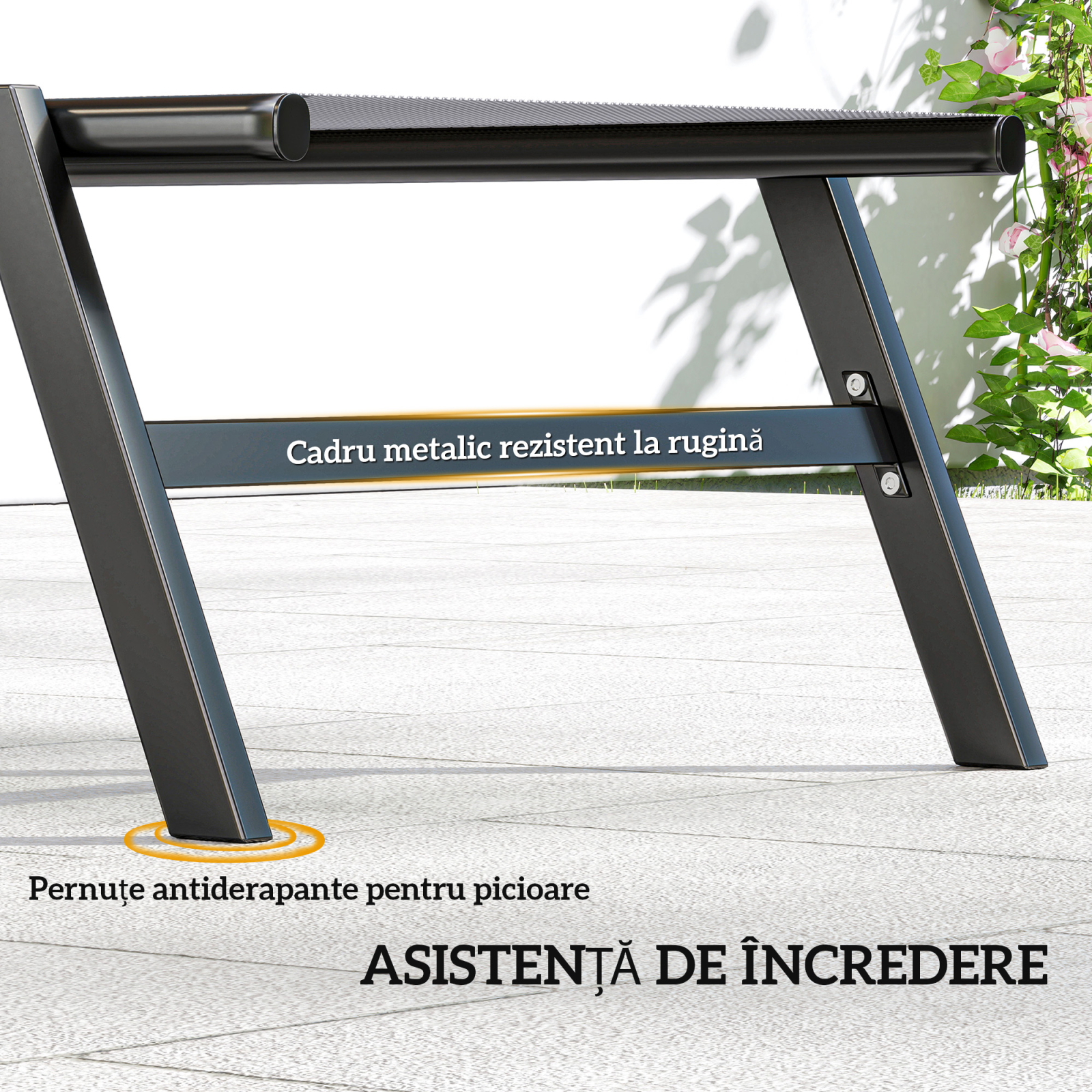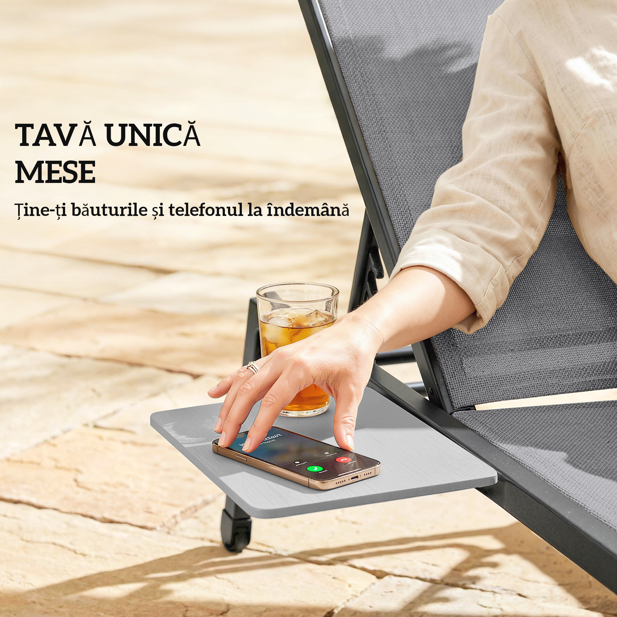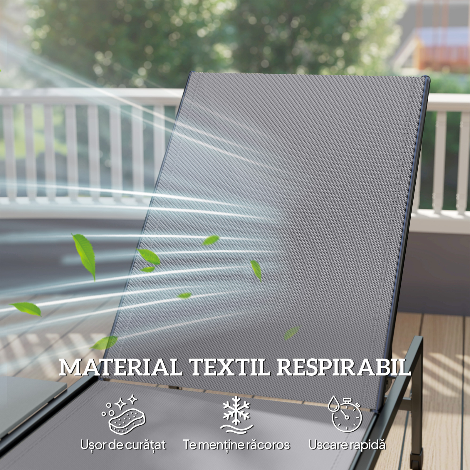 Imagineaza-ti o dupa-amiaza linistita langa apa, fara griji. Setul de sezlonguri de gradina [BRAND NAME] ofera relaxare completa. Include doua sezlonguri cu spatar reglabil in cinci pozitii si mese laterale integrate. Usor de mutat datorita rotilor din spate, garanteaza confort de durata cu tesatura respirabila si structura robusta. Suporta pana la 120 kg. Necesita asamblare.