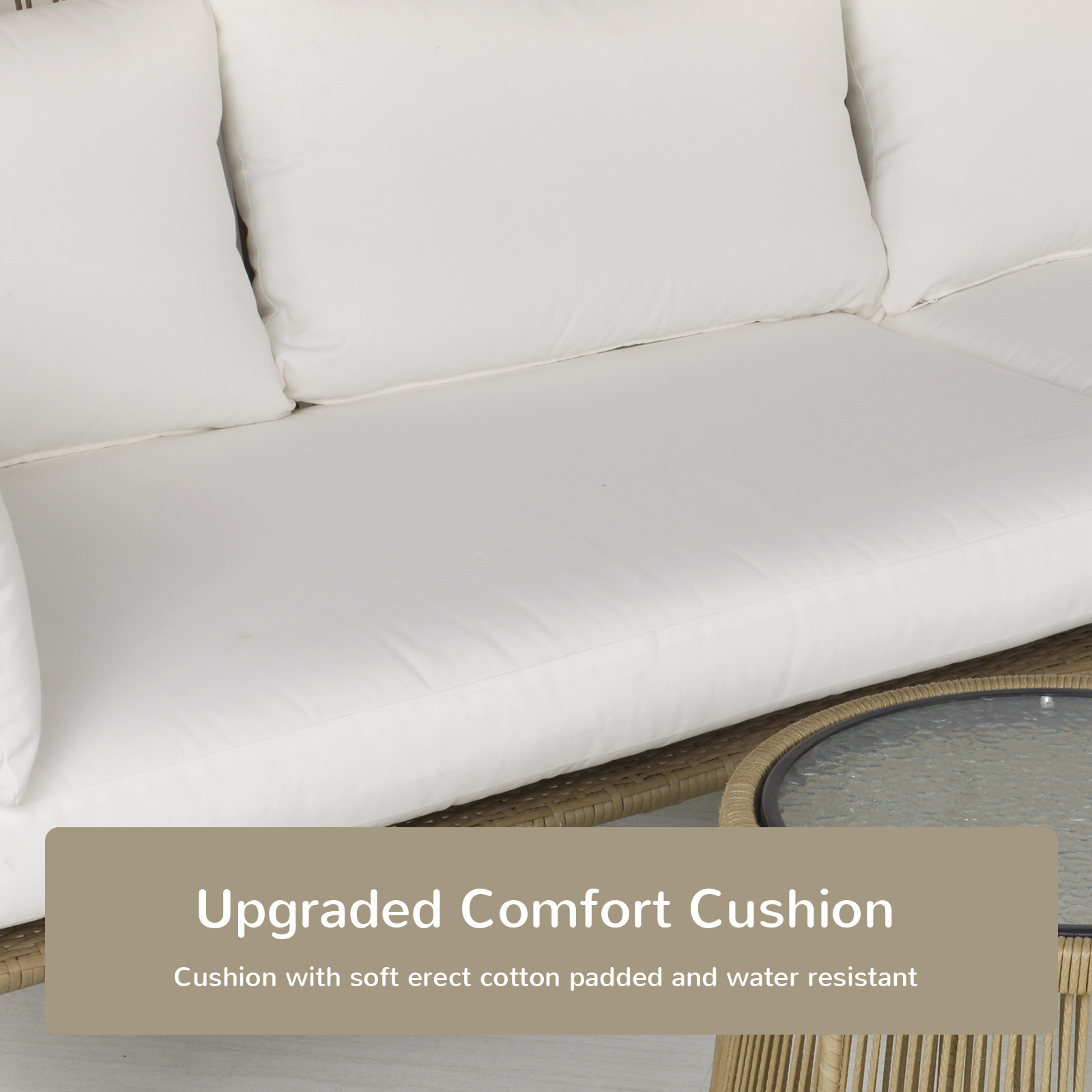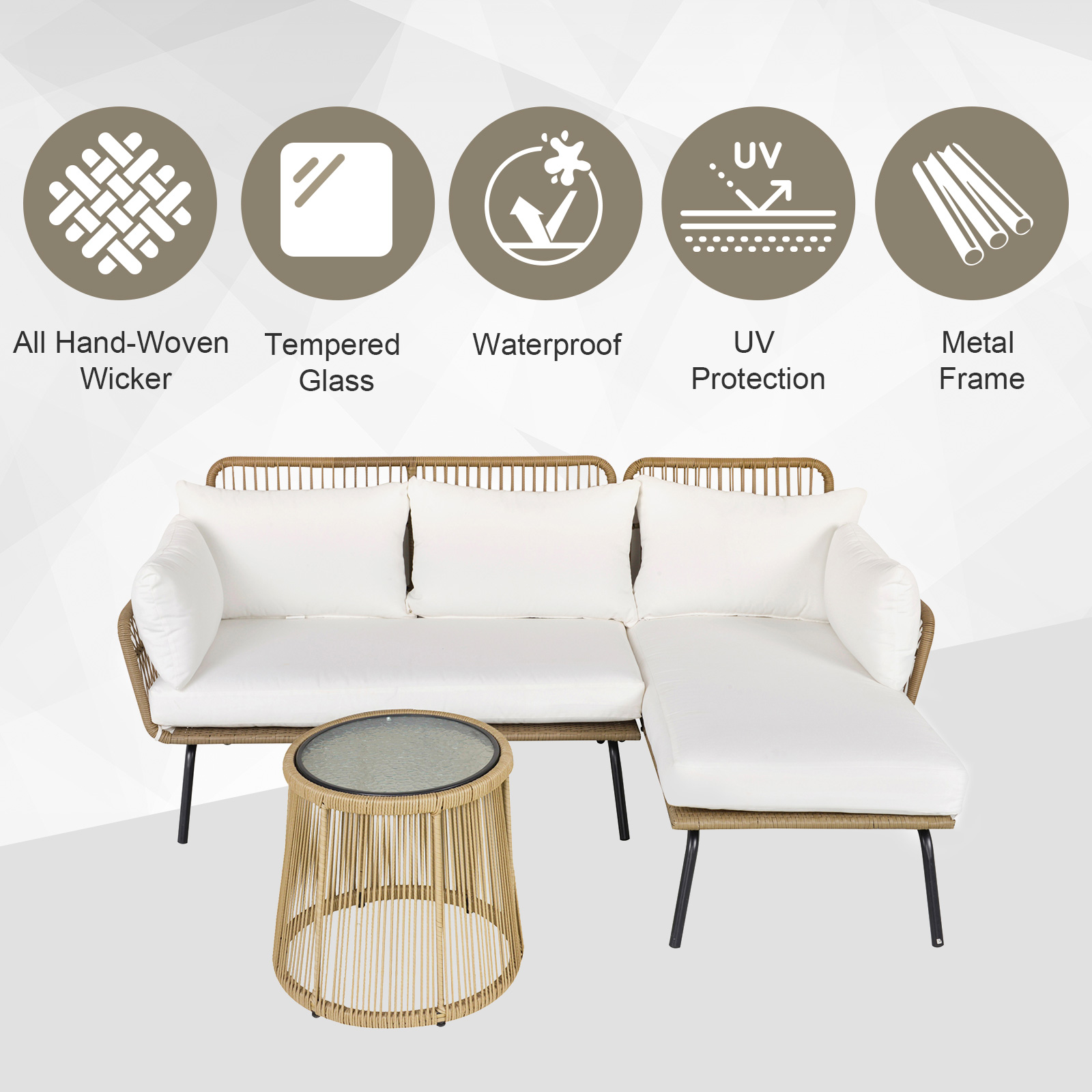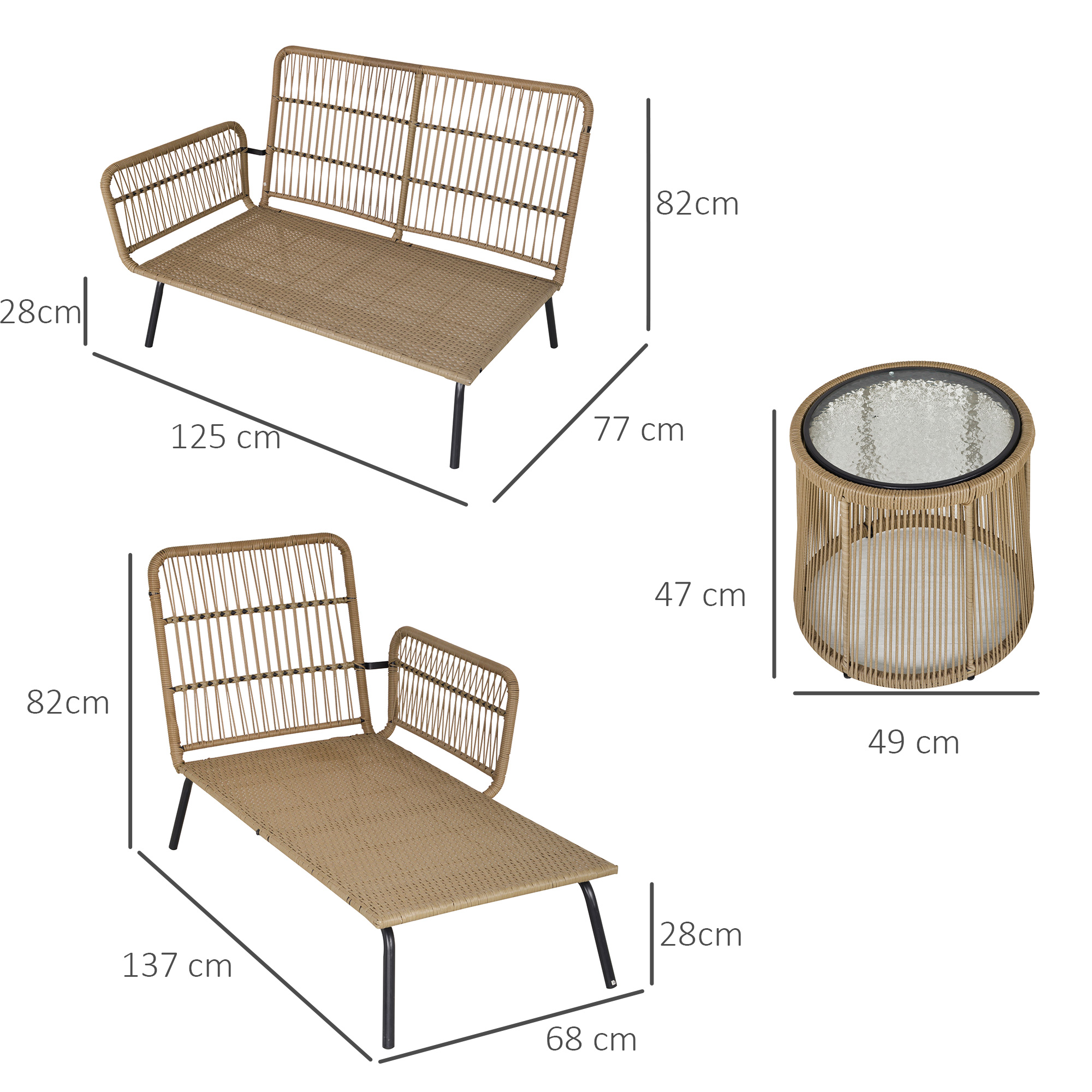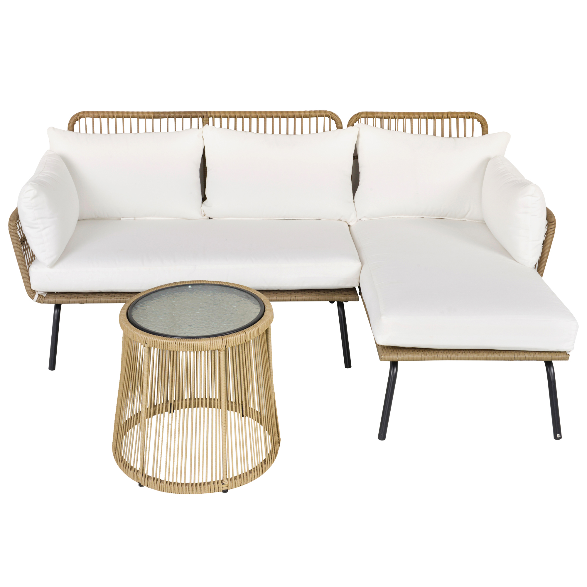 Doriti sa va reinnoiti mobilierul de gradina? Acest set [BRAND NAME] din 3 piese va aduce eleganta si confort in spatiuldvs.! Setul este format dintr-o masuta de cafea, o canapea cu 2 locuri si un sezlong care se combina ca o canapea de colt. Structura solida din otel si ratanul sintetic garanteaza soliditatea si rezistenta structurii acestui mobilier de gradina. Pernele moi va ofera un confort optim pentru relaxare in aer liber, in timp ce masuta cu blat din sticla ttratata adauga un plus de eleganta.