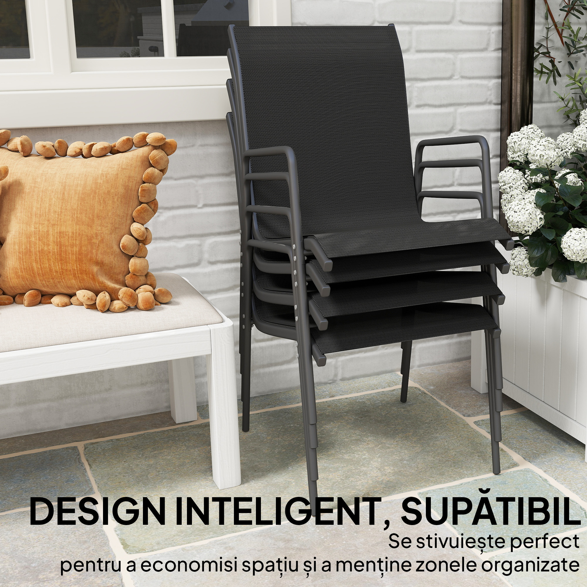 Da viata noua spatiilor exterioare sau interioare cu scaunele de gradina [BRAND NAME]. Cu o structura solida din metal si plasa respirabila, ofera confort pentru mese, conversatii sau momente de relaxare in aer liber. Usoare si suprapozabile pentru economisirea spatiului, picioarele antiderapante asigura stabilitate. Ideale pentru terase, balcoane, gradini sau zone de luat masa, acest set de 4 scaune de exterior combina practicitatea cu un stil modern pentru utilizarea zilnica.