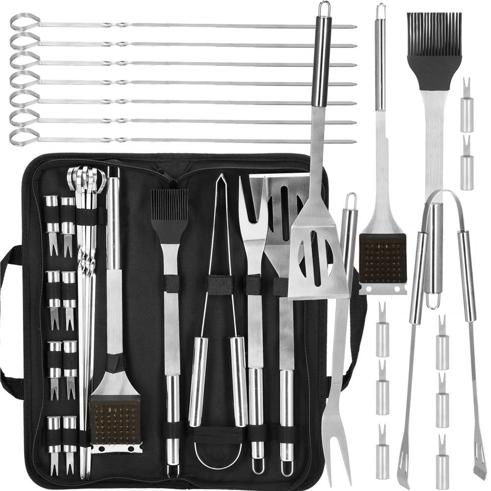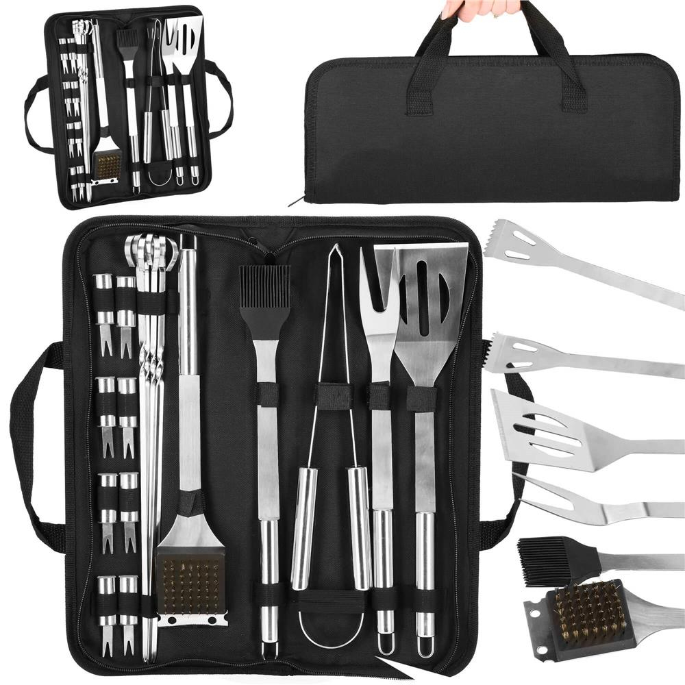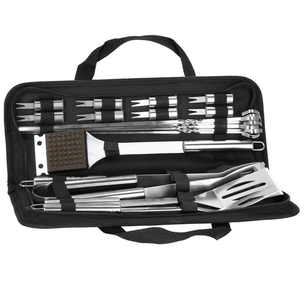 Set accesorii gratar inox 20 piese cu furculita spatula cleste perie, rezistente la caldura, husa transport inclusa