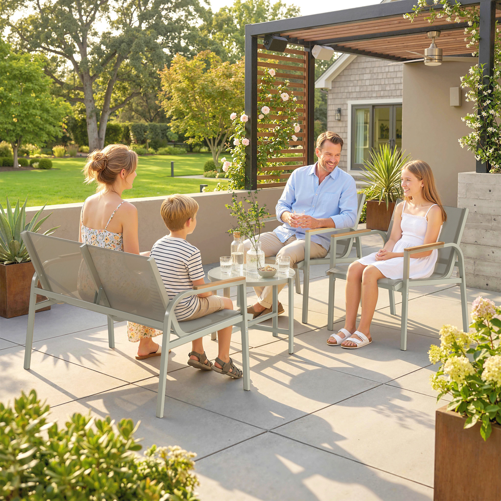 O terasa goala poate parea trista, iar scaunele incomode ingreuneaza primirea prietenilor. Setul de mobilier de gradina [BRAND NAME], cu tesatura respirabila Texteline si scaune modulare, creeaza o oaza confortabila. Acest set de patru piese transforma spatiul tau exterior intr-un loc de relaxare si conexiune, adaptandu-se oricarei ocazii cu canapeaua cu doua locuri.