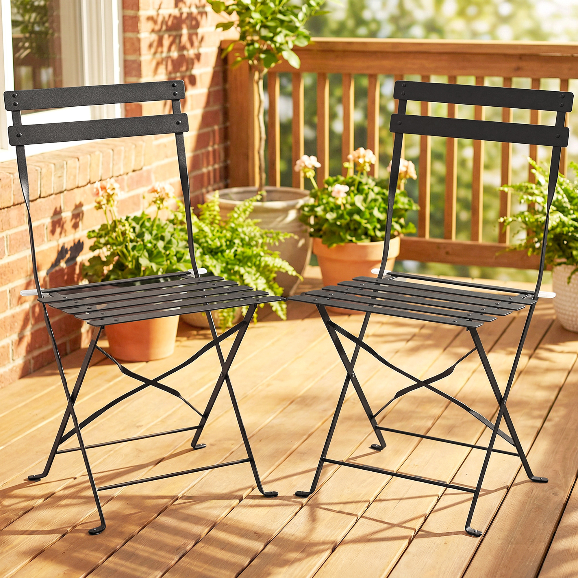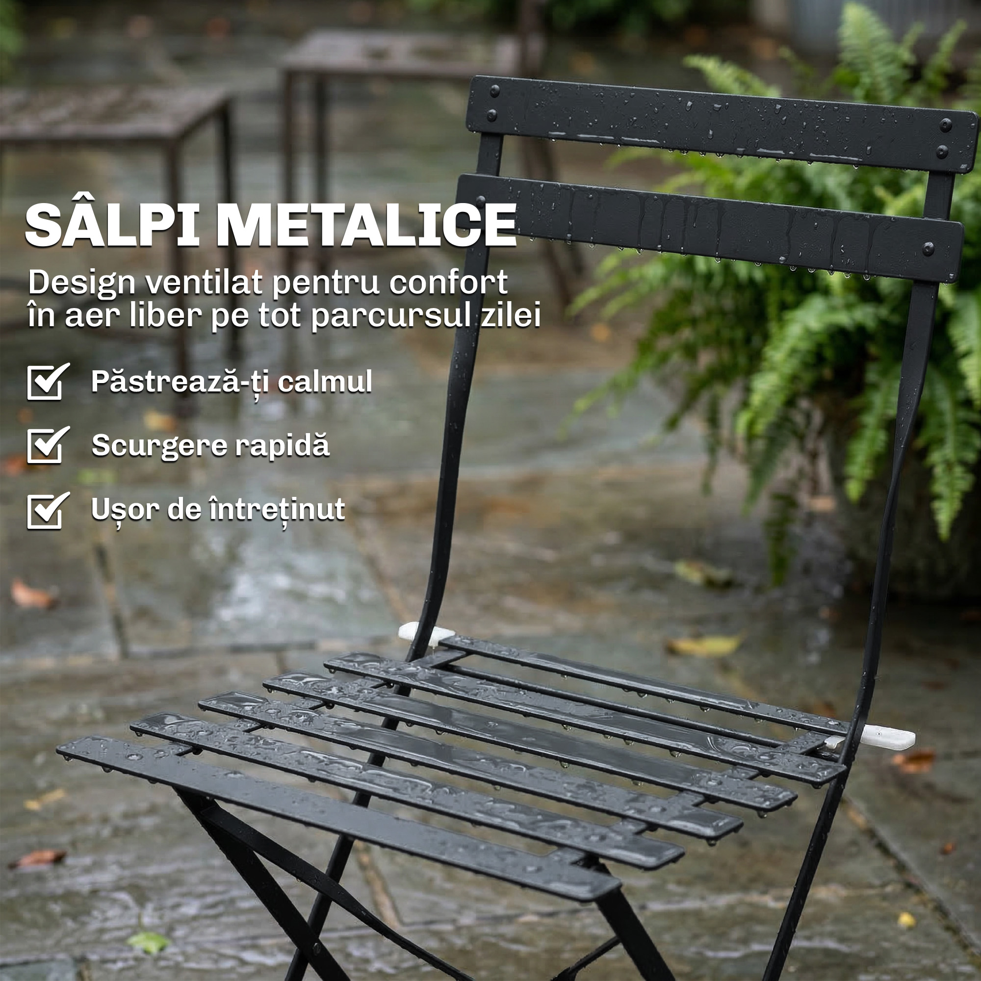 Setul de scaune de gradina [BRAND NAME] ofera relaxare imediata, fara a necesita asamblare. Stratul dublu anti-rugina asigura protectie impotriva intemperiilor. Pliabile si cu o grosime de doar 9,5 cm, acestea sunt usor de depozitat. Perfecte pentru a economisi spatiu si a te bucura de stabilitate si confort.