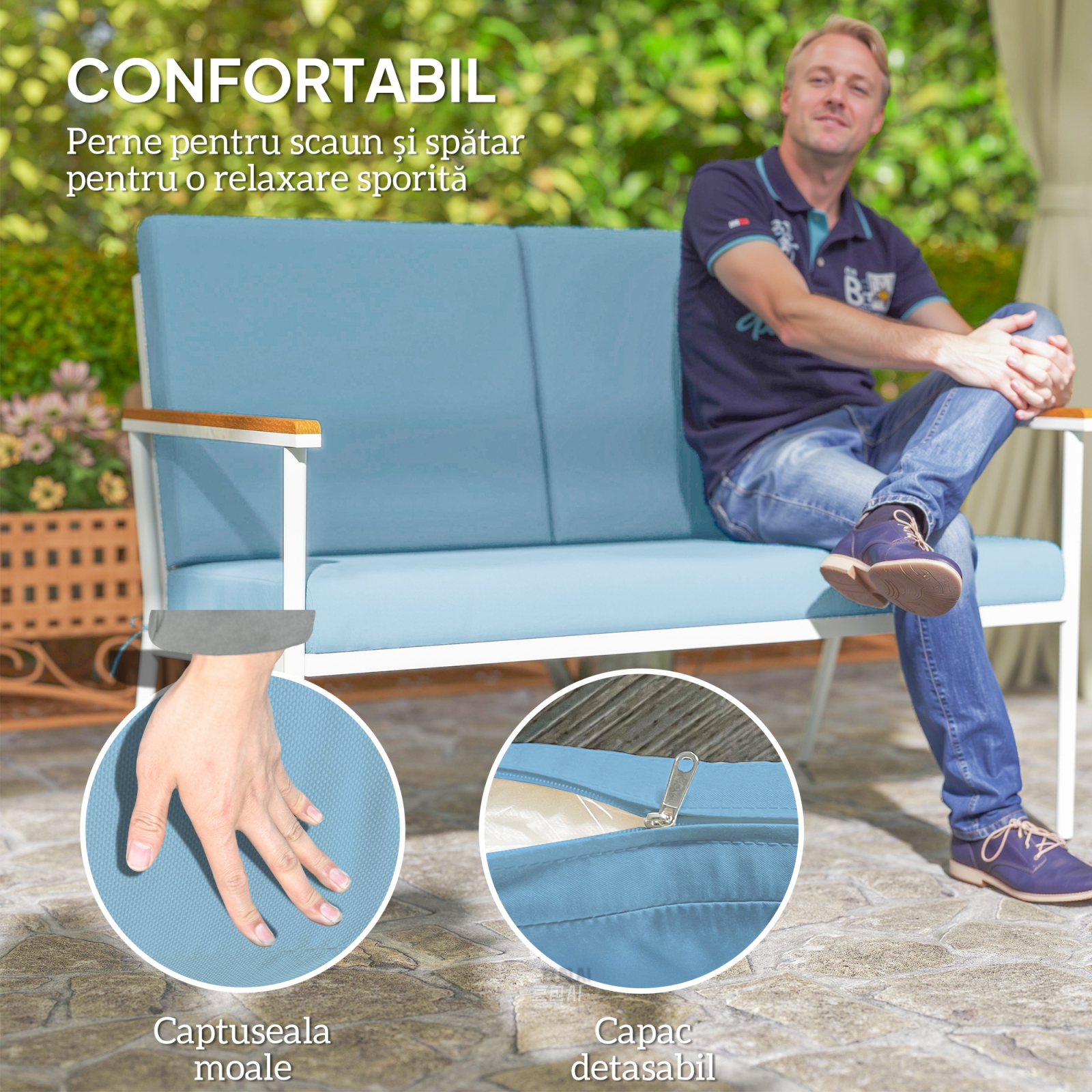 Transforma-ti gradina intr-o oaza de relaxare cu setul de mobilier de gradina [BRAND NAME]. Compus dintr-o canapea cu doua locuri, doua fotolii cu brate cu aspect de lemn si doua masute de cafea triunghiulare cu blat din sticla securizata, acest set de mobilier pentru exterior adauga o nota de eleganta. Pernele detasabile si lavabile ofera confort maxim in timp ce te relaxezi in compania celor dragi in spatiile tale in aer liber.