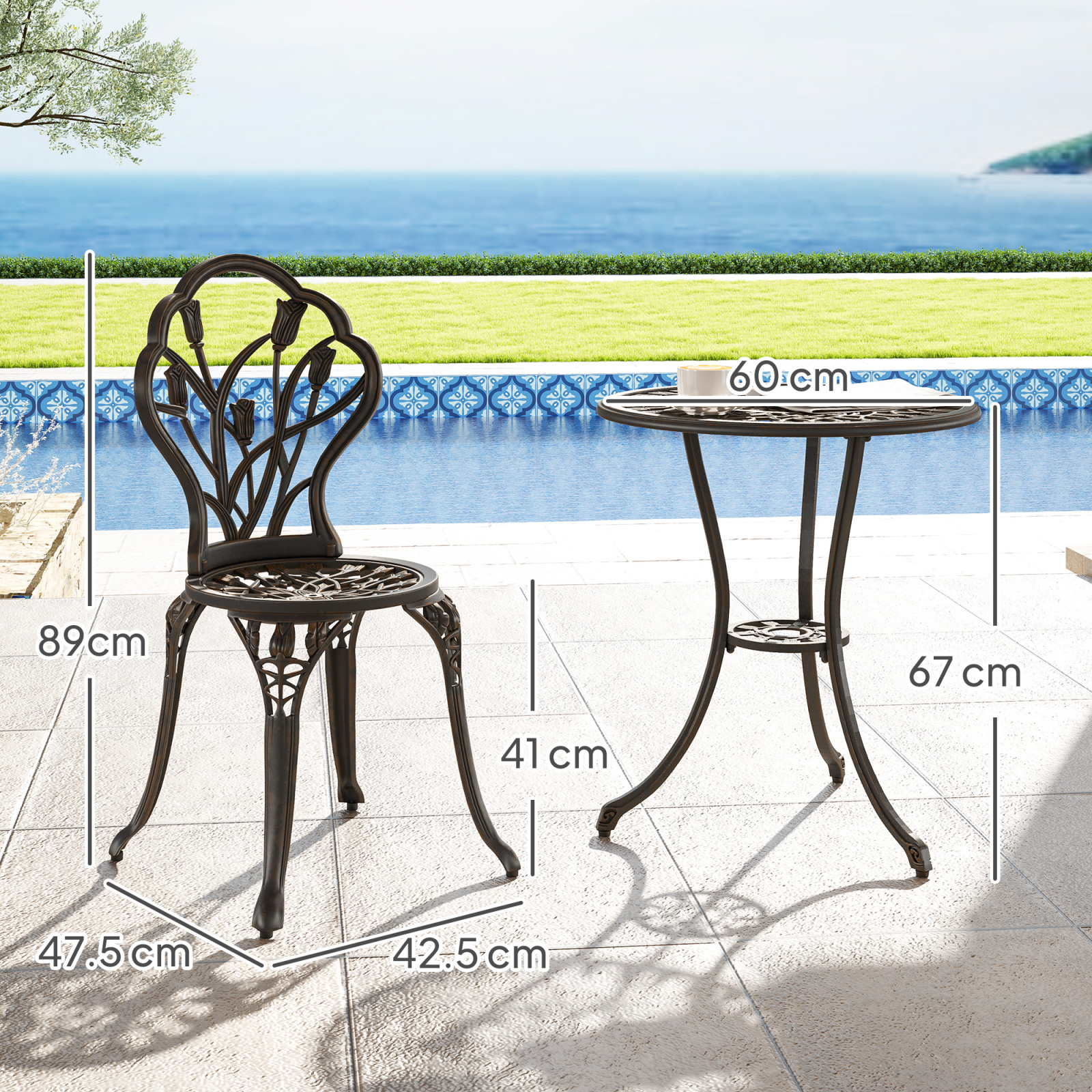 Bucura-te de momente speciale in aer liber cu farmecul vintage al setului de gradina [BRAND NAME], format din 3 piese. Realizat din aluminiu turnat pentru o durabilitate exceptionala, setul are un model sculptat de lalele, care il face elegant si unic. Masa de dining este echipata cu un orificiu pentru umbrela, perfect pentru a oferi umbra si siguranta cu un parasolar in zilele insorite.