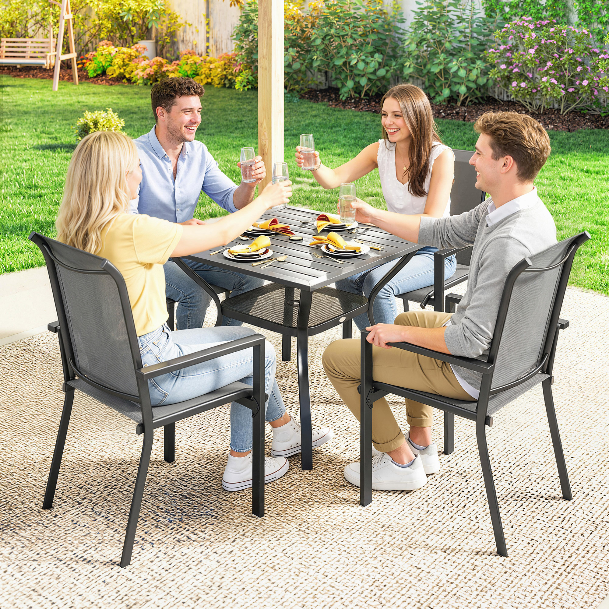 Transforma-ti gradina in locul perfect pentru socializare cu setul de masa de pranz cu 5 piese de la [BRAND NAME]. Format dintr-o masa eleganta de 90 x 90 cm si patru scaune din mesh respirabil, este ideal pentru intalniri animate sau mese in familie. Blatul modern al mesei, cu efect de lemn gri, adauga stil, iar scaunele suprapozabile economisesc spatiu cand nu sunt utilizate. Proiectat pentru confort si practica, acest set este alegerea ideala pentru mesele in aer liber.