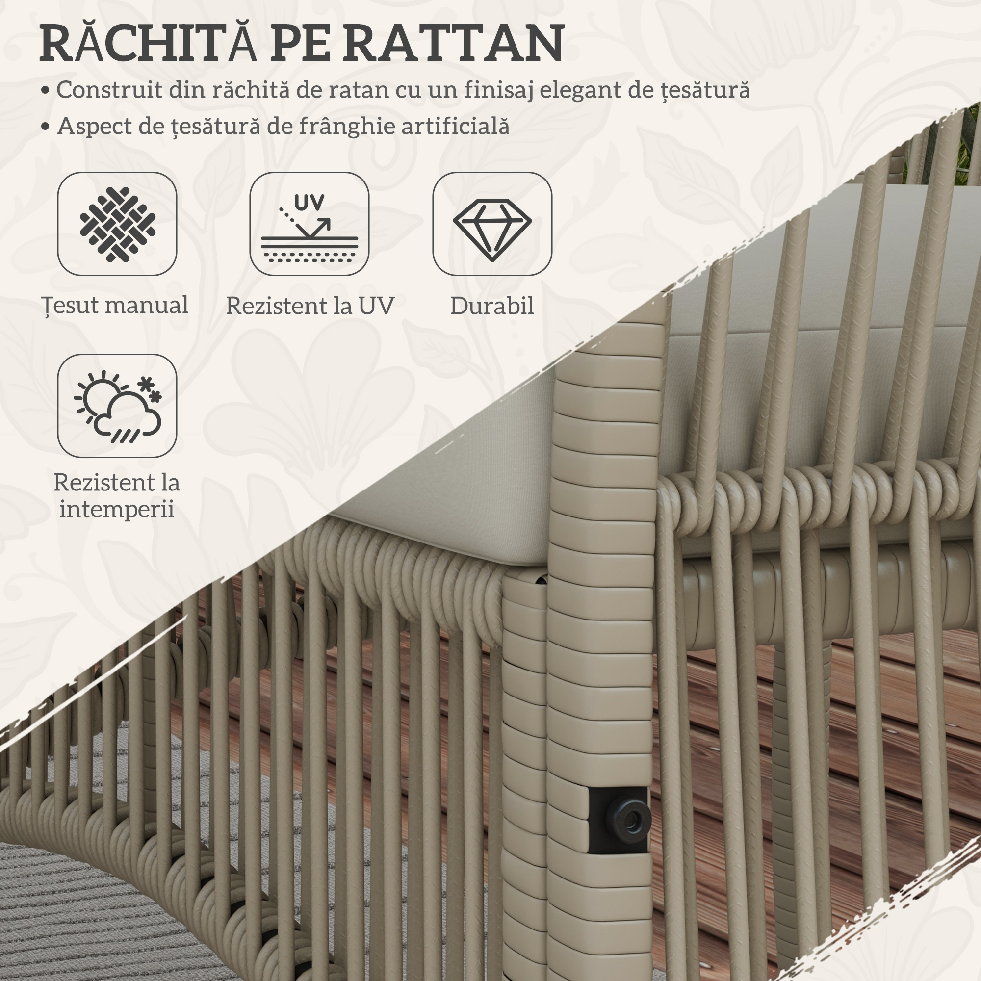innoieste-ti gradina si fa spatiile exterioare ale locuintei tale primitoare si confortabile. Acest set de gradina [BRAND NAME] este compus din 4 piese si realizat cu o structura robusta din otel si ratan PE, fiind potrivit pentru utilizare in toate sezoanele. Decorative si functionale, piesele setului de exterior creeaza o atmosfera pentru terasa, patio si veranda, permitandu-ti sa te cufunzi in relaxare si dupa-amiezi placute in companie.