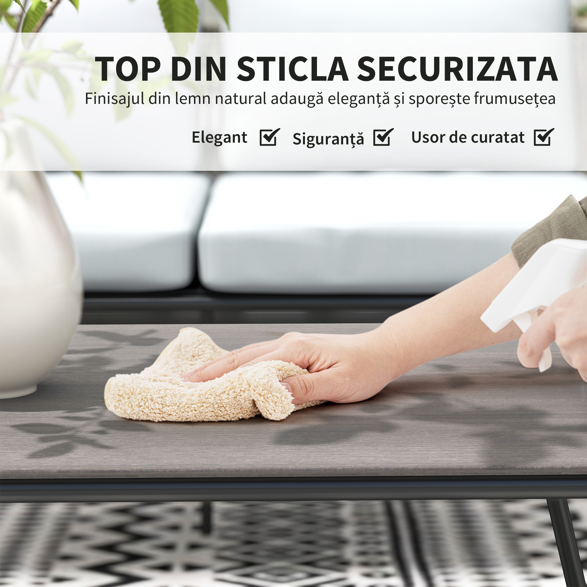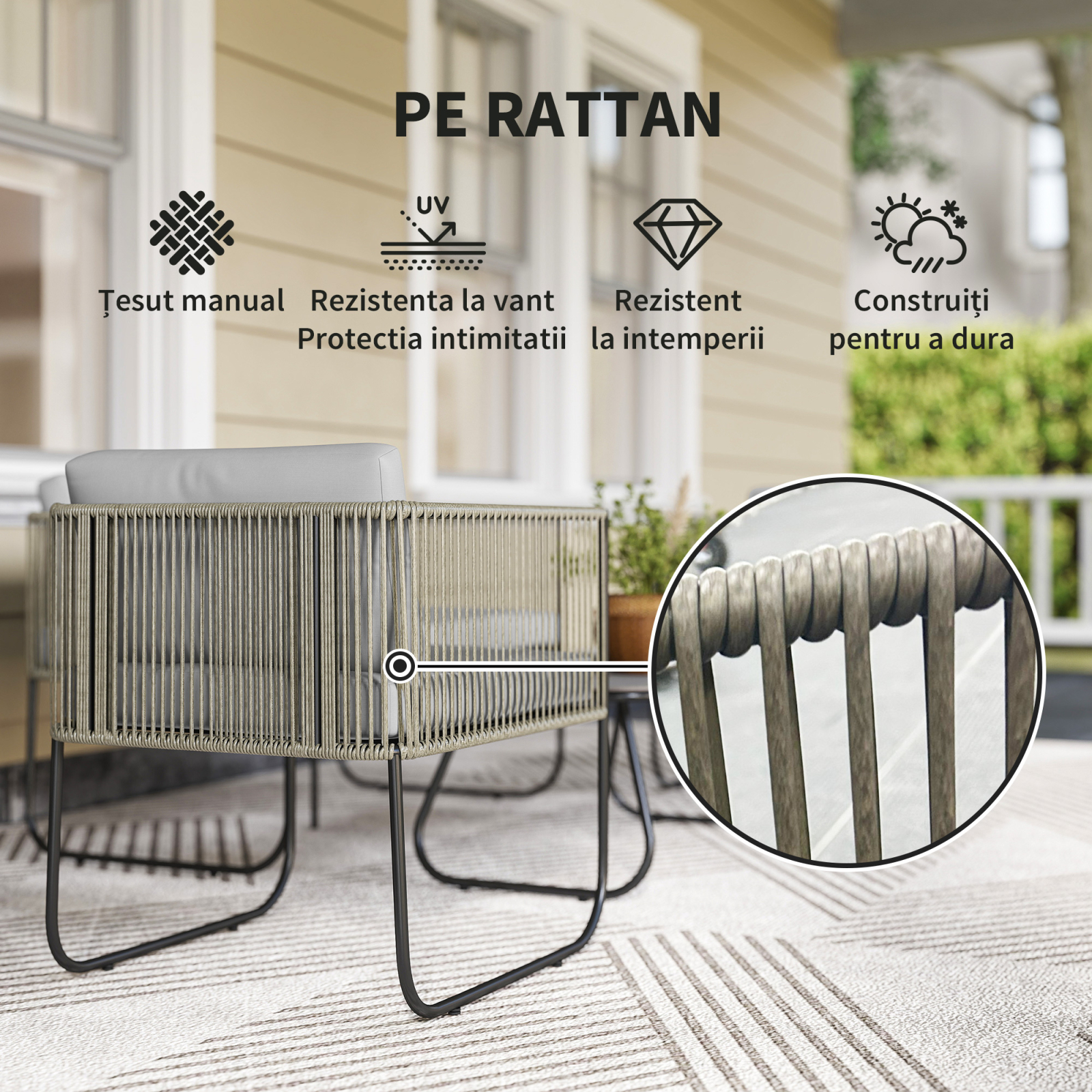 Transformati gradina intr-un colt de relaxare cu Setul de Canapele [BRAND NAME]. Acest set encantator de patru piese include doua fotolii, un loveseat si o masa de cafea, perfect pentru spatii restranse ca punti, terase sau balcoane, aducand stil si functionalitate. Relaxati-va pe pernele spumoase, usor de demontat si curatat. Masa de cafea de exterior, cu blat din sticla temperata si finisaj natural, este ideala pentru servirea bauturilor si gustarilor.