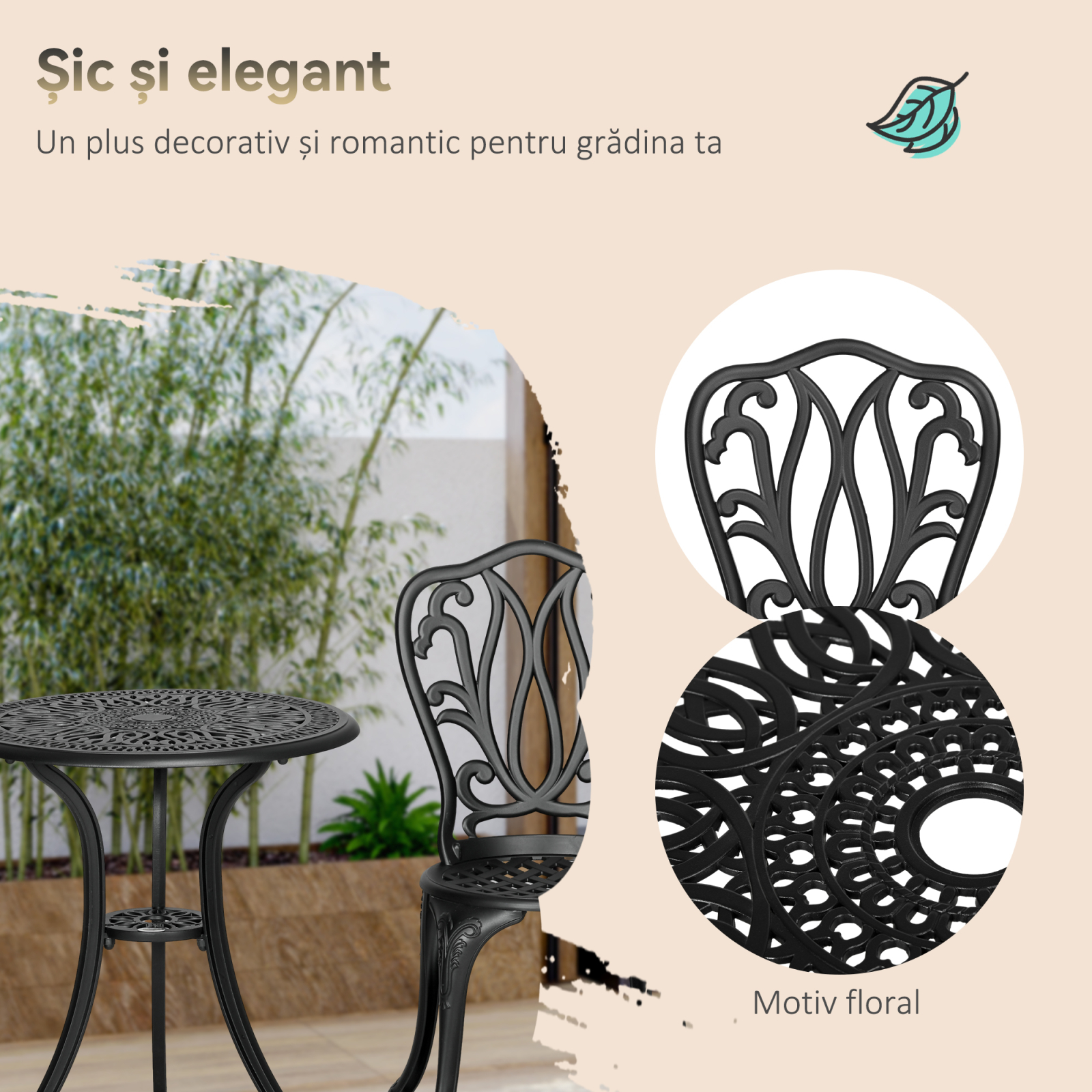 Adauga un strop de eleganta gradinii sau terasei tale cu acest set retro fermecator de 3 piese. Fabricat din aluminiu turnat cu linii rafinate in stil fier forjat, acest set de gradina va infrumuseta spatiul tau exterior! Masa rotunda este echipata cu un orificiu pentru umbrela, ideal pentru relaxare in aer liber la umbra.