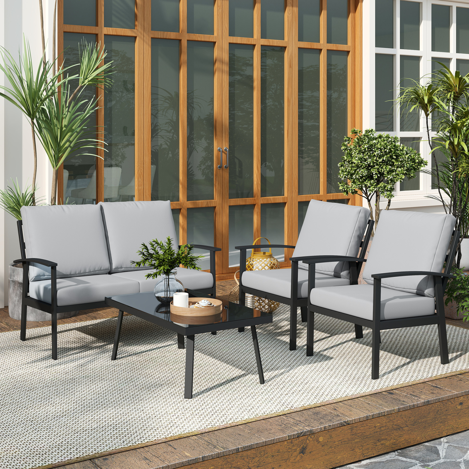 Creeaza un colt de relaxare in gradina cu setul de mobilier [BRAND NAME] format din canapea dubla, doua fotolii si o masuta eleganta. Designul modern si structura durabila sunt completate de perne confortabile. Ideal pentru terase, foisoare sau zone lounge exterioare.