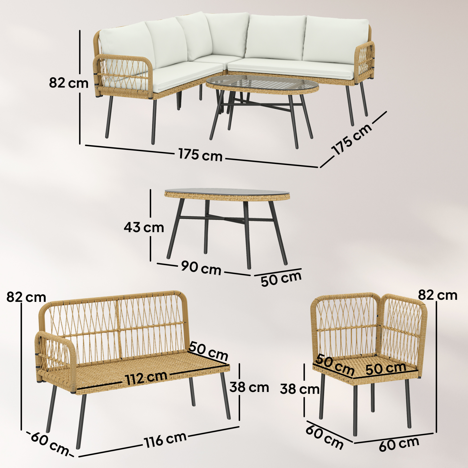 Aduceti frumusetea si confortul in exterior cu acest set de mobilier de gradina din ratan de la [BRAND NAME]: doua canapele, o canapea coltar si o masuta. Cu o structura solida din otel, ratan rezistent din plastic, perne moi si o masa cu suprafata din sticla usor de curatat, acest set este ideal pentru relaxare, discutii sau weekenduri linistite pe terasa sau balcon.