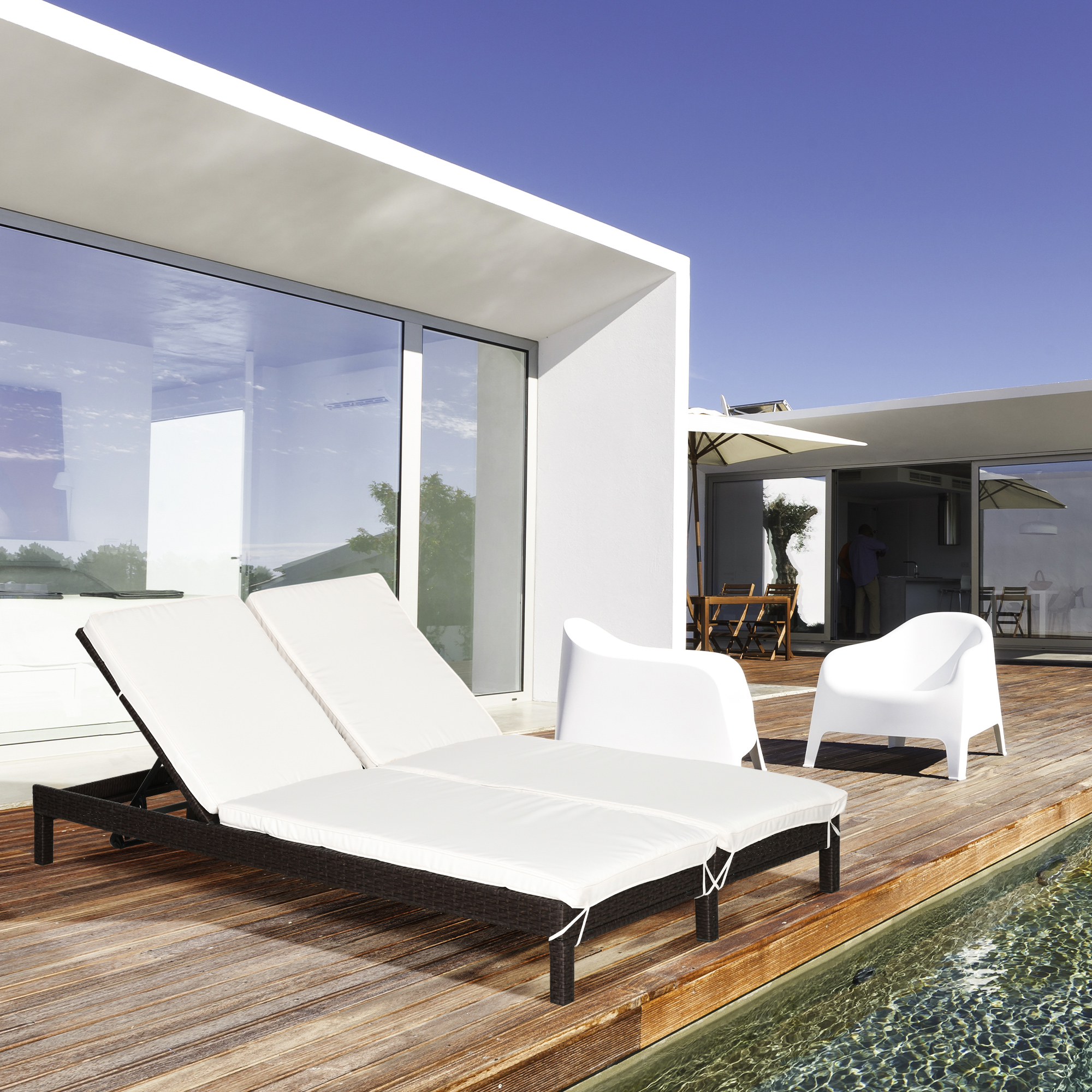 Relaxati-va la soare cu noul dvs. sezlong cu 2 locuri [BRAND NAME]. Construit din otel si ratan sintetic, este un produs puternic si durabil, potrivit pentru relaxare. Va puteti relaxa confortabil pe cele doua saltele captusite si puteti regla spatarul in inaltime pe 5 nivele diferite. Culorile sale delicate si designul esential sunt perfecte pentru a da o nota de eleganta mediului inconjurator.