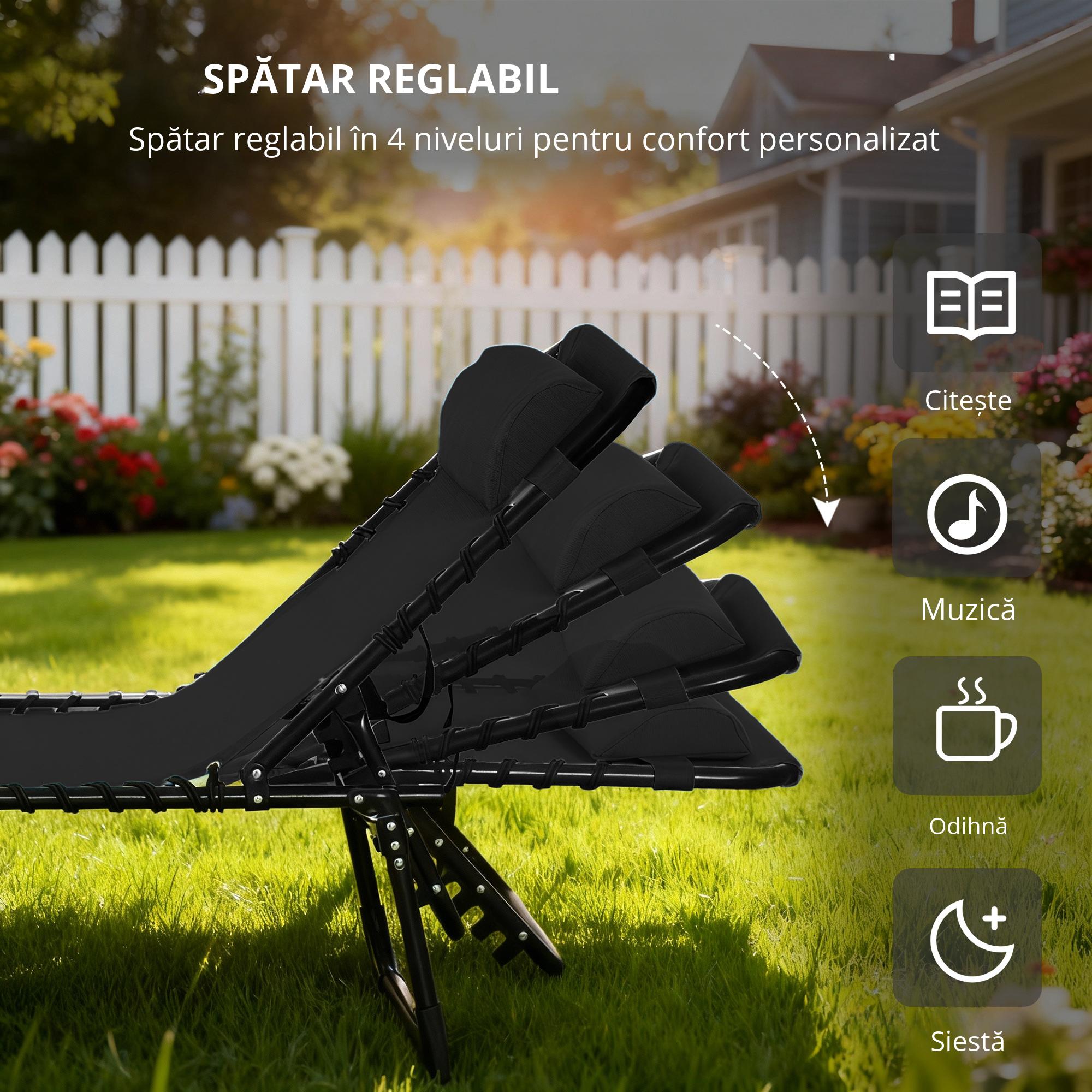 Acest sezlong rabatabil [BRAND NAME] este conceput pentru a va permite sa va odihniti in zilele lungi de vara in aer liber. Datorita spatarului reglabil pe diferite niveluri, puteti sa stati si sa cititi sau sa va intandeti pentru a trage un pui de somn. Suspensia prin corzi elastice si plasa respirabila ajuta la reducerea tensiunii musculare si a stresului. De asemenea, sezlongul poate fi pliat compact pentru a fi depozitat usor in masina.