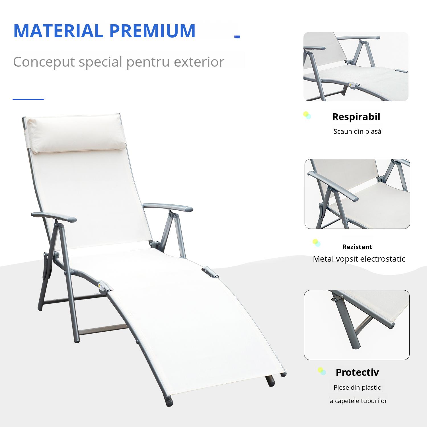Scaun de sezut [BRAND NAME] cu tesatura mesh respirabila cu structura metalica pentru confort maxim. Spatar reglabil pe 7 niveluri cu perna detasabila. Structura robusta din otel, suporta pana la 165 kg greutate. Tesatura rezistenta la apa, ideala pentru gradina si piscina. Design pliabil pentru transport usor.
