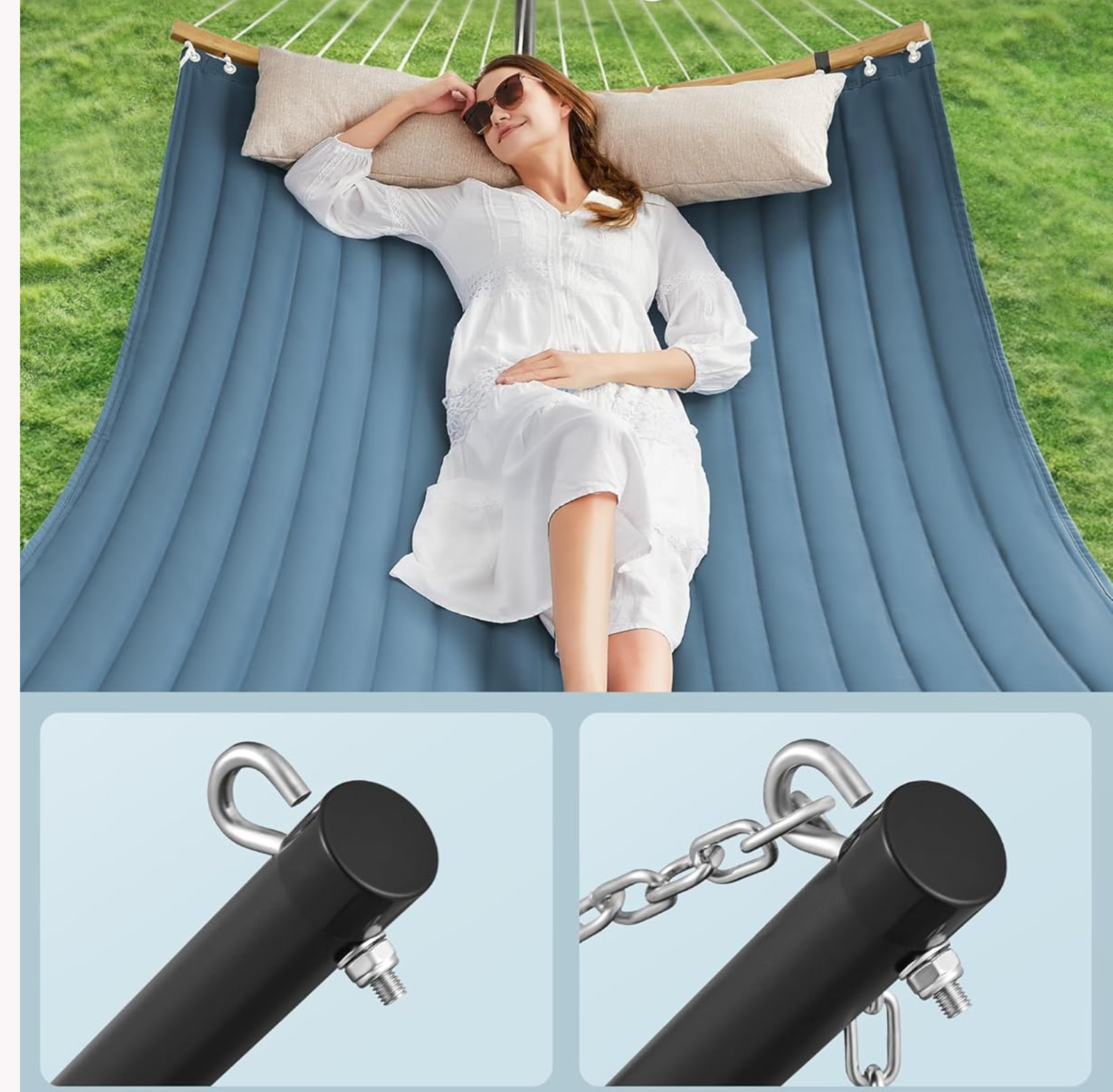 Hamacul SONGMICS cu suport metalic este solutia ideala pentru relaxare fara a necesita copaci sau sisteme de prindere suplimentare. Structura stabila si materialul confortabil ofera o experienta placuta, perfecta pentru gradina, terasa sau camping.