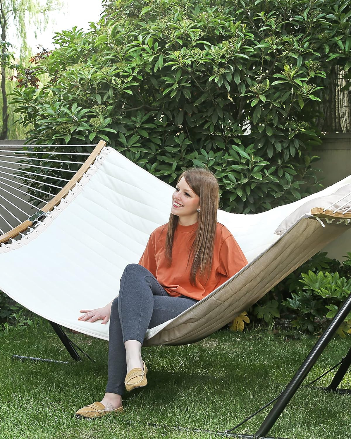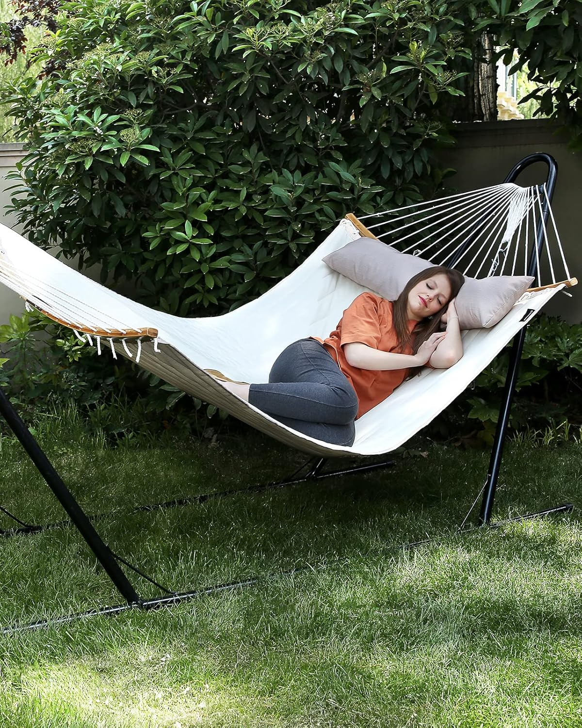 Brius Hamac dublu cu bare curbate din bambus, perna inclusa, maxim 225 kg, 200x140 cm, crem