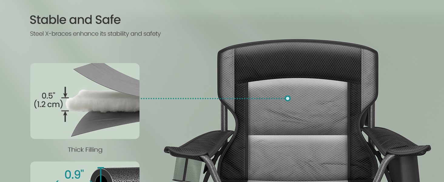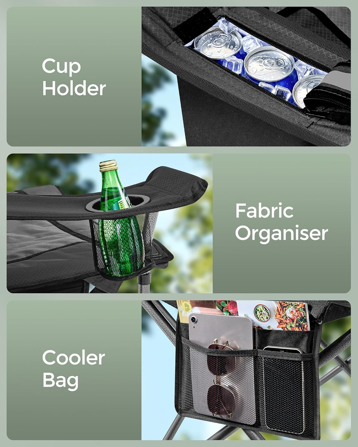 Scaunul pliabil SONGMICS este o alegere premium pentru confort in aer liber, oferind un sezut lat si buretat, spatar inalt si suport lombar reglabil. Dotat cu suport pentru bauturi, buzunar termo si organizator, iti pune la indemana tot ce ai nevoie pentru relaxare completa. Structura robusta garanteaza stabilitate si durabilitate.
