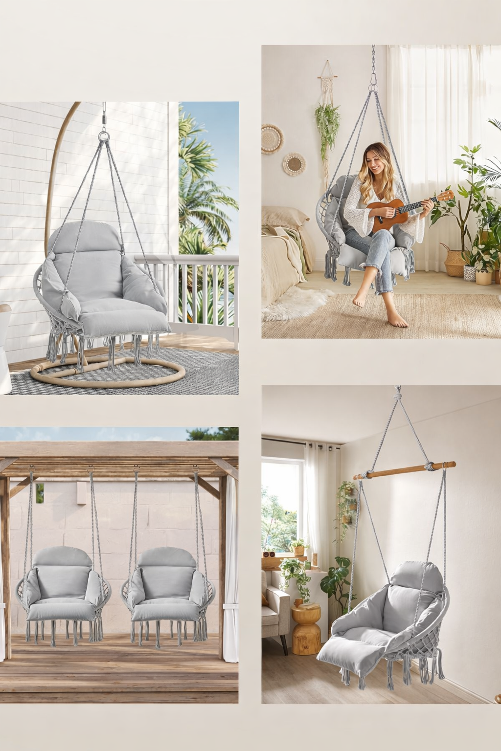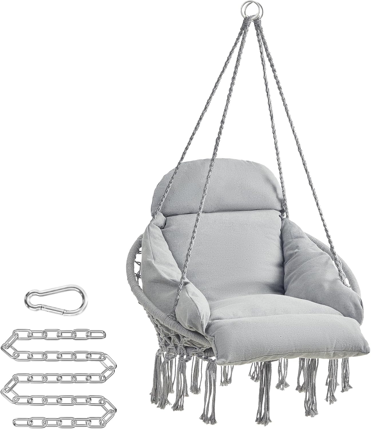 Scaunul suspendat SONGMICS aduce un plus de confort si stil in orice spatiu, fie ca este vorba despre living, balcon sau gradina. Designul modern cu influente boho si perna groasa transforma fiecare moment de relaxare intr-o experienta placuta si relaxanta.