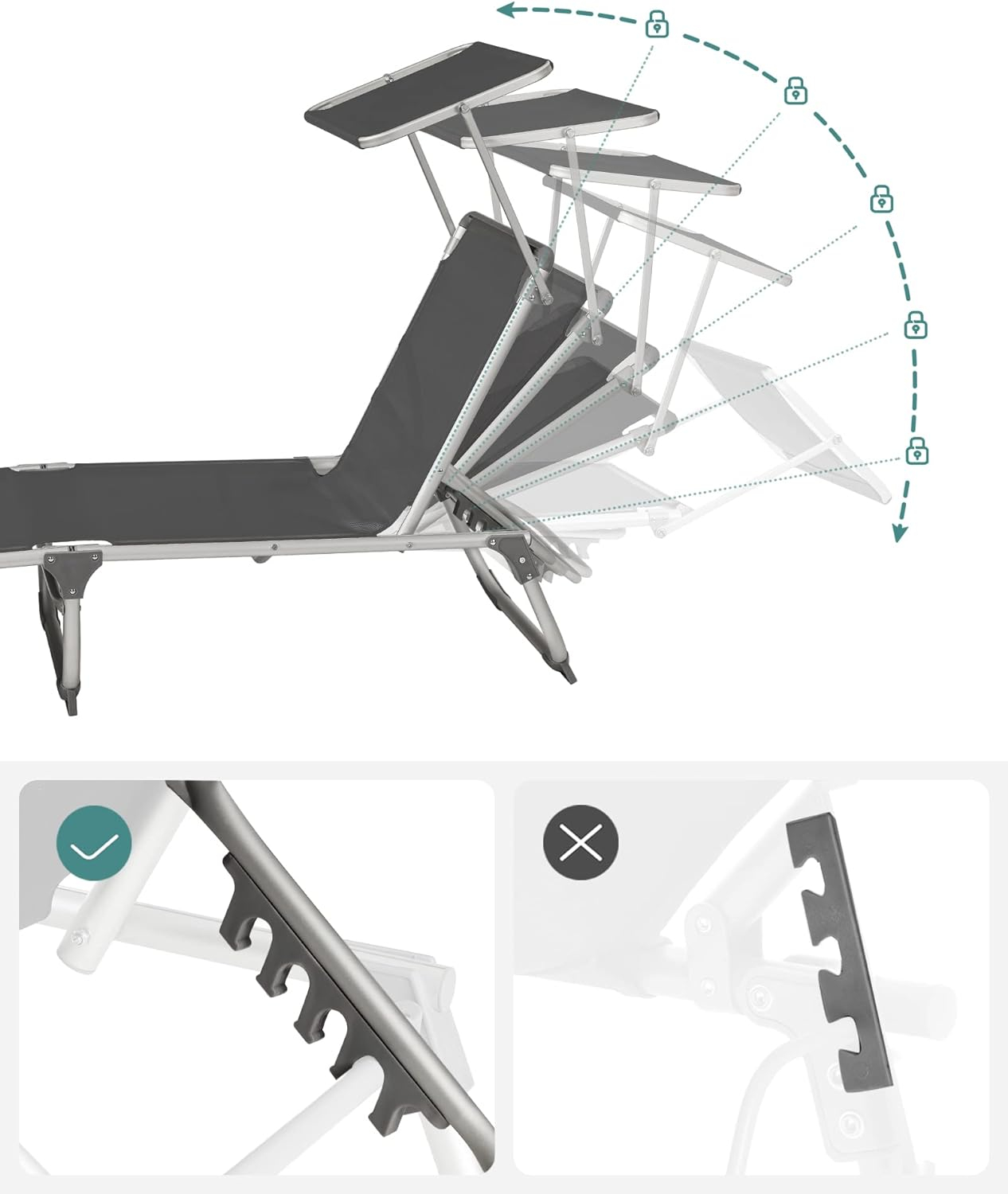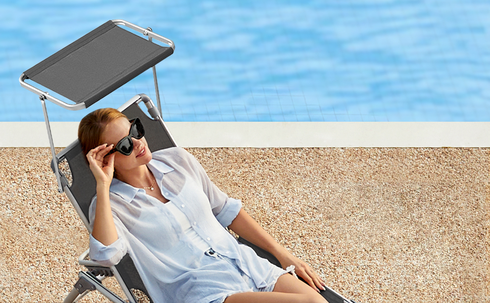 Acest sezlong, cu o tesatura sintetica respirabila, impiedica umezeala sa se ataseaze de scaun. Relaxati-va in voie, chiar si in timpul celor mai fierbinti zile de vara. Acest sezlong are o umbrela de soare, care va permite sa cititi reviste in curte in timp ce va bucurati de soare. Puteti regla cu usurinta unghiul parasolarului cu mana, fara a fi nevoie sa va ridicati.