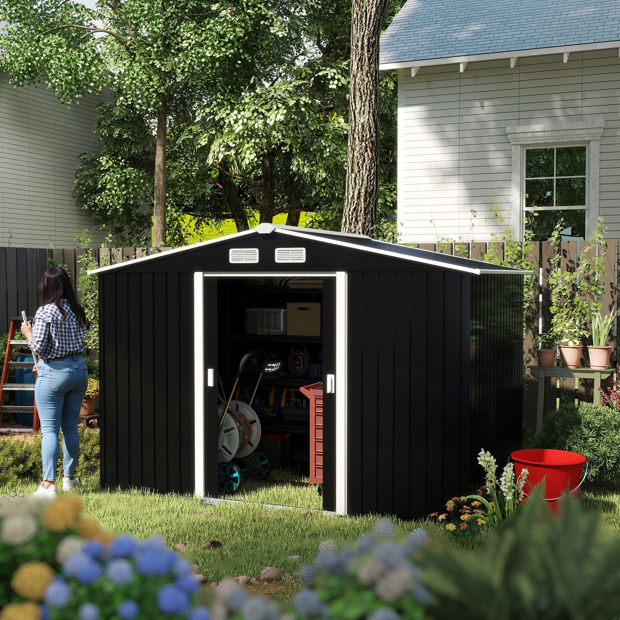 Adaugati spatiu de depozitare cu un sopron de gradina in aer liber [BRAND NAME]. Acest sopron din otel are avantaje semnificative fata de modelele traditionale din lemn, ceea ce il face mai atractiv pentru achizitie. O magazie din otel este mai durabila si ofera o protectie mai buna impotriva pericolelor. Daca sunteti in cautarea unui spatiu de depozitare in aer liber dar nu doriti sa va confruntati cu costurile si intretinerea unui model din lemn, aceasta magazie de gradina este alegerea perfecta.