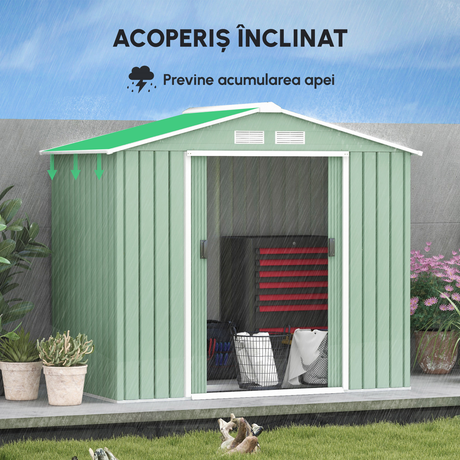 Alegeti sopronul de gradina din tabla de otel [BRAND NAME] si pastrati-va toate articolele in siguranta. Acest sopron de gradina are o suprafata vopsita rezistenta la rugina si la intemperii, precum si o baza solida cu pereti ranforsati. Perfect pentru depozitarea uneltelor si a mobilierului de exterior, magazia noastra de scule este solutia ideala pentru a pastra totul in siguranta pe vreme rea.