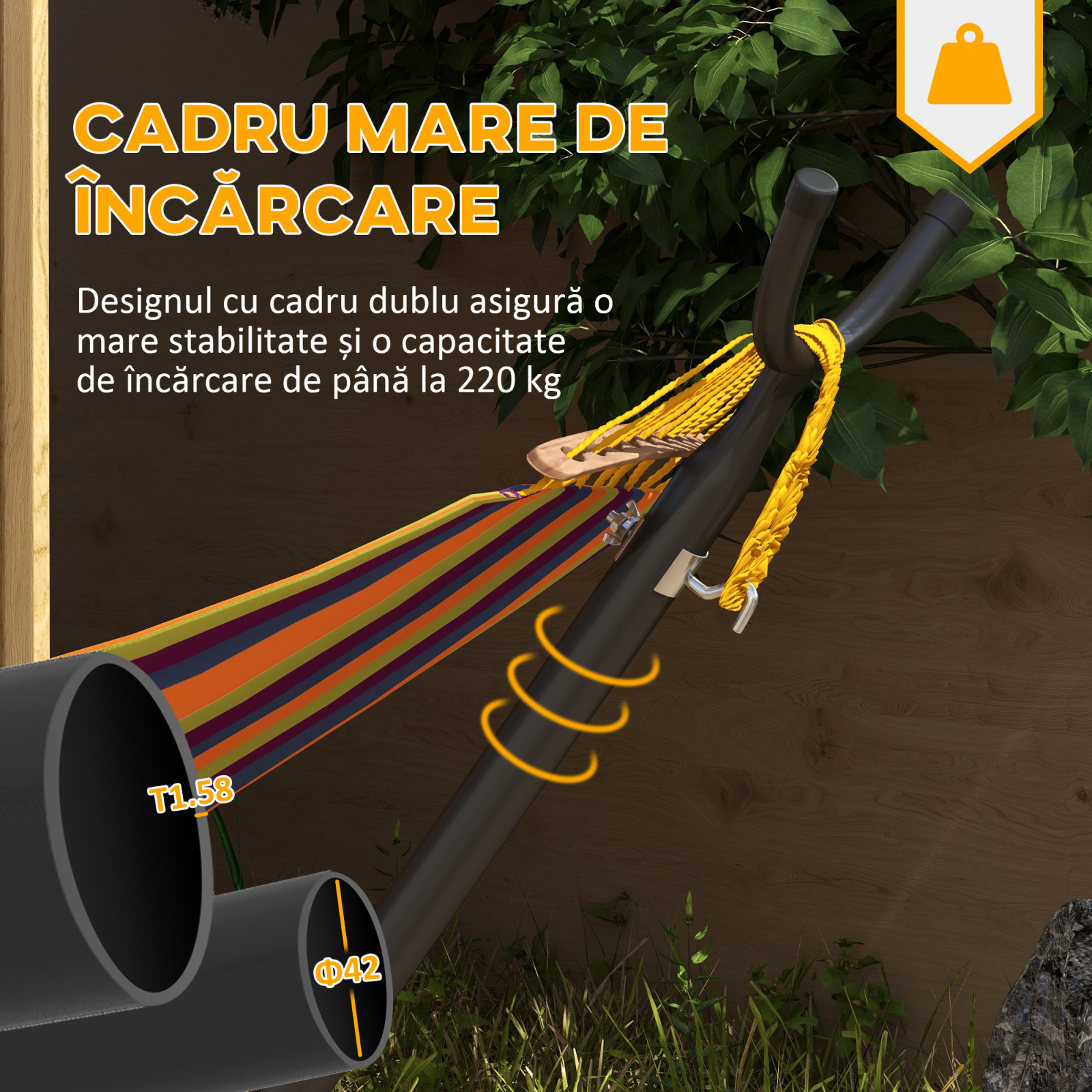 Doriti un hamac, dar nu aveti unde sa-l agatati? Cu acest suport metalic pentru hamac de la [BRAND NAME] nu trebuie sa gasiti un copac care se potriveste perfect pentru a va agata hamacul preferat. Realizat din tub metalic acoperit cu pulbere, poate rezista tuturor conditiilor meteorologice si se potriveste pentru balcon, gradina, curte, veranda, dormitor, camera de zi sau orice alte spatii. Va puteti bucura cu usurinta de timpul liber, fara probleme. Suportul nostru este prevazut cu roti si geanta de transport, pentru deplasare si depozitare usoara. Un gadget inteligent si functional pentru timpul liber!