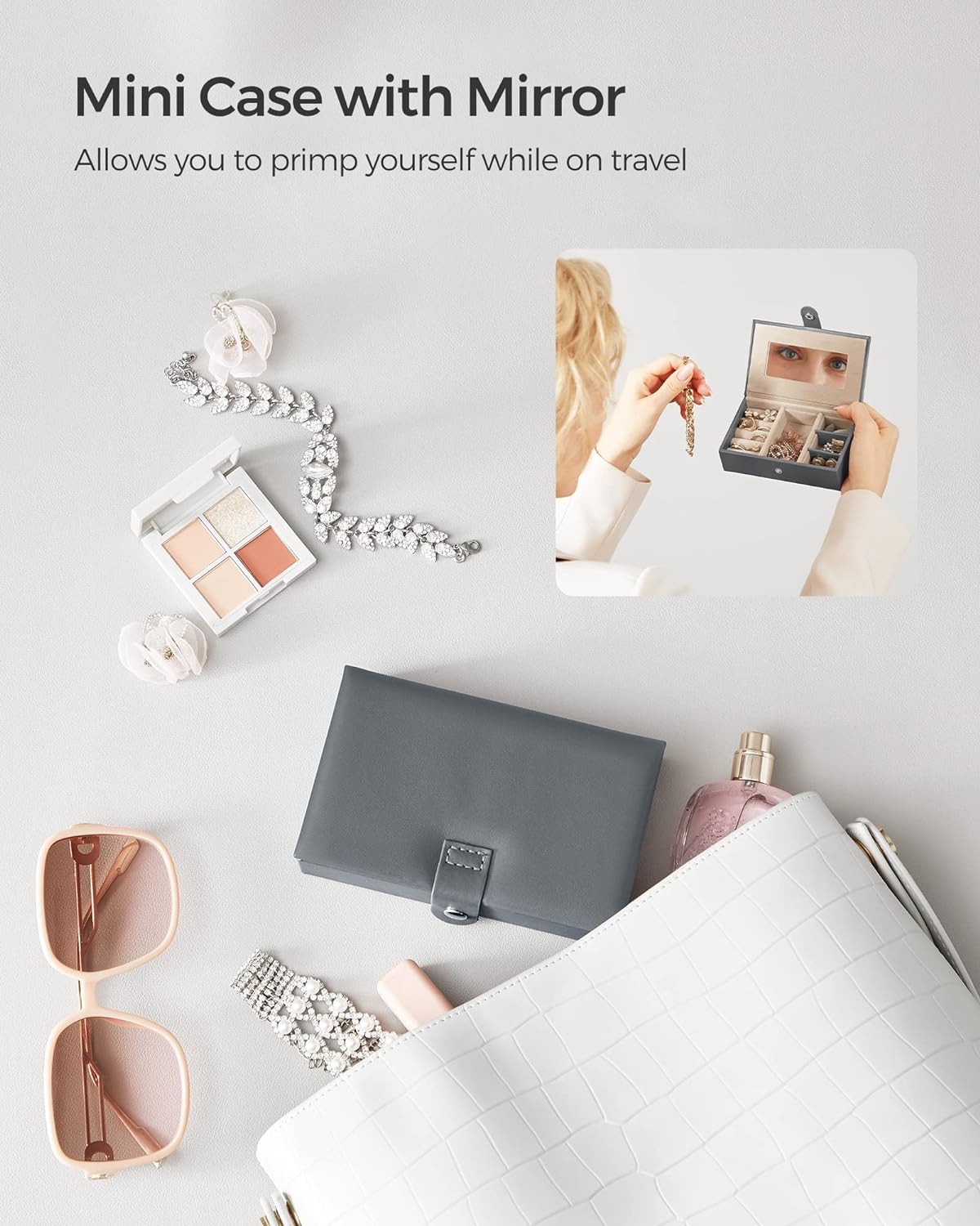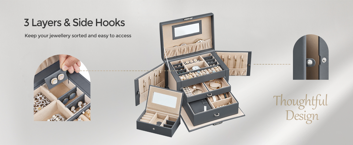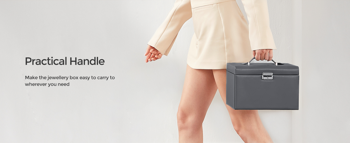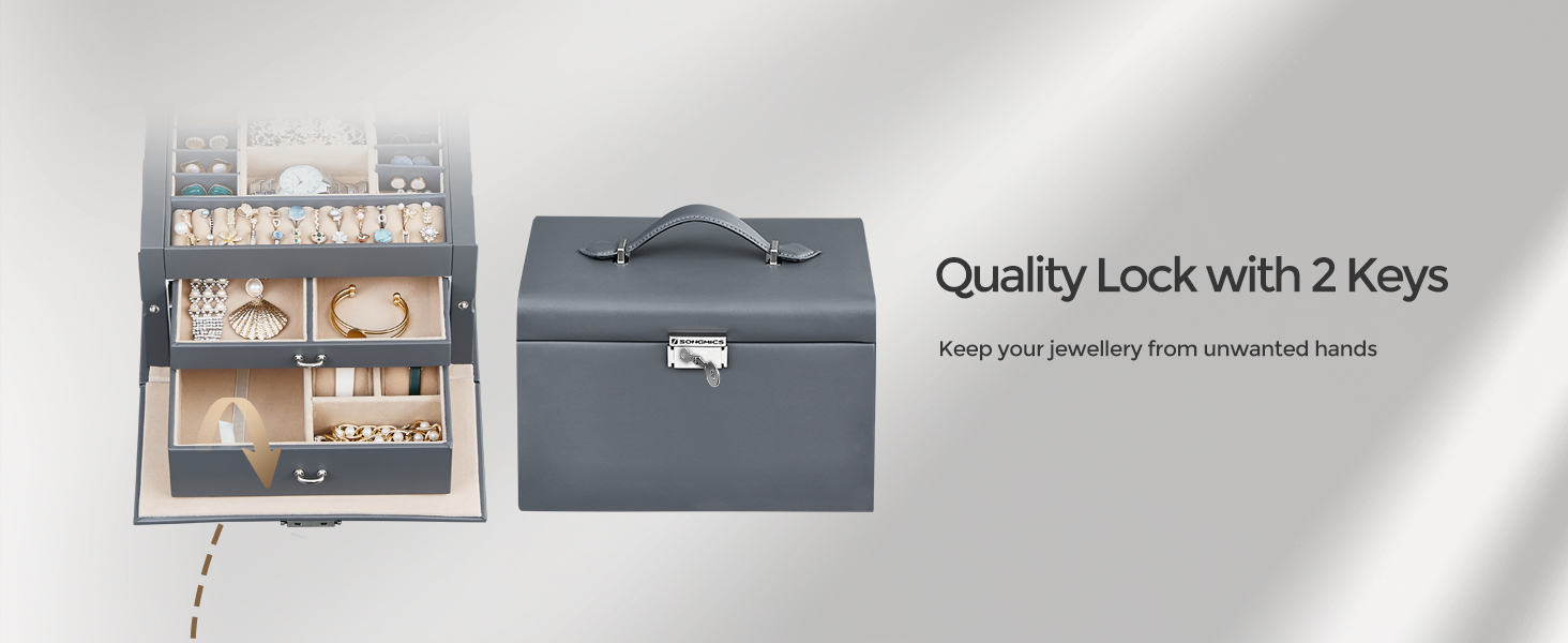 SONGMICS Cutie de bijuterii pe 3 nivele, cu 2 sertare, maner, oglinda, inchidere cu cheie, 18x26x17, gri