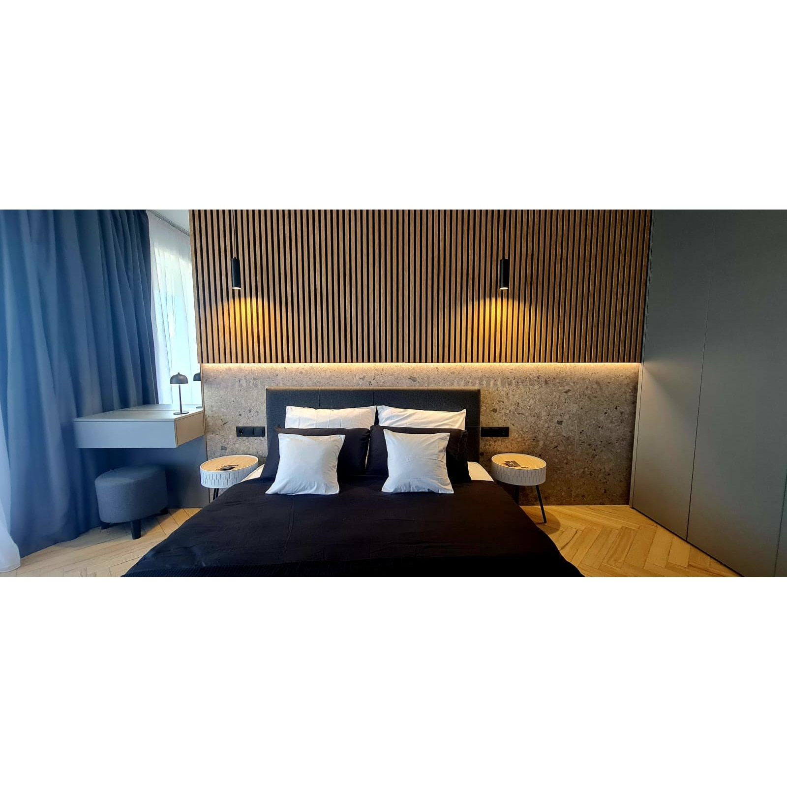 Adauga eleganta si functionalitate spatiului tau cu un panou decorativ acustic tip riflaj, realizat din MDF premium si montat pe un suport PET netesut reciclat. Cu un finisaj sofisticat si un design modern, acest panou este ideal pentru perete sau tavan, in locuinte, birouri sau spatii comerciale. Structura sa acustica ajuta la reducerea zgomotului ambiental, oferind in acelasi timp un aspect vizual rafinat. Se instaleaza usor (multiple variante de fixare: adeziv, holsuruburi, etc) si permite acoperirea suprafetelor fara imbinari vizibile, asigurand un rezultat continuu si uniform. Este o alegere excelenta pentru cei care doresc sa imbina designul contemporan cu un produs sustenabil, realizat in Uniunea Europeana din materiale reciclabile. Specificatii generale Tip produs: Panou decorativ acustic Material lamele: MDF E1 Material suport: Feltru PET reciclat Finisaj: Stejar Natur Saragossa (folie continua pe margini) Culoare suport: Negru Dimensiuni: 260 x 40 x 2 cm (L x l x grosime) Montaj: Pe perete sau tavan Utilizare: Interior (locuinte birouri comerciale studiouri) Caracteristici principale Design modern ideal pentru amenajari elegante sau minimaliste Fonoabsorbant reduce zgomotul ambiental si reverberatiile Instalare rapida fara imbinari vizibile intre panouri Produs non-toxic realizat din materiale certificate EU Fabricat integral in Uniunea Europeana Potrivit pentru dormitor living hol birou sau bucatarie Materiale ecologice cu impact redus asupra mediului Transport si ultilizare: ambalarea si livrarea poate fi facuta in cutii de carton care pot contine pana la 3 bucati, indiferent daca achizitia este facuta la nivel de bucata sau set; Produsul este destinat strict pentru interiorul locuintelor (nu exterior) si acesta nu trebuie montat in zone cu umiditate mare (gen: bai)