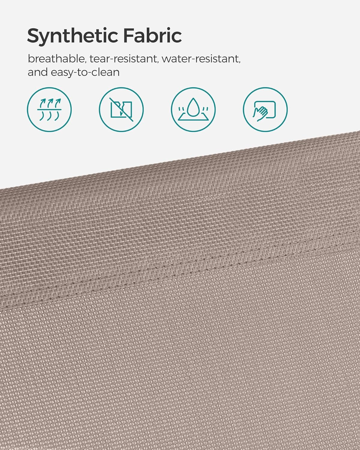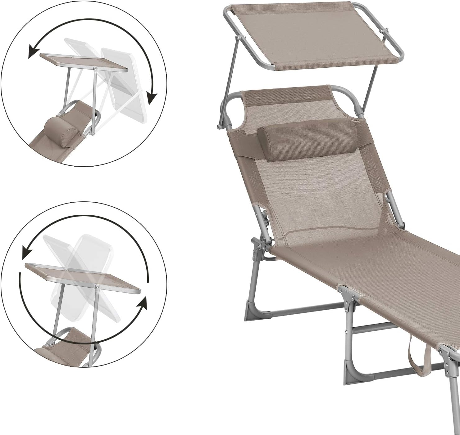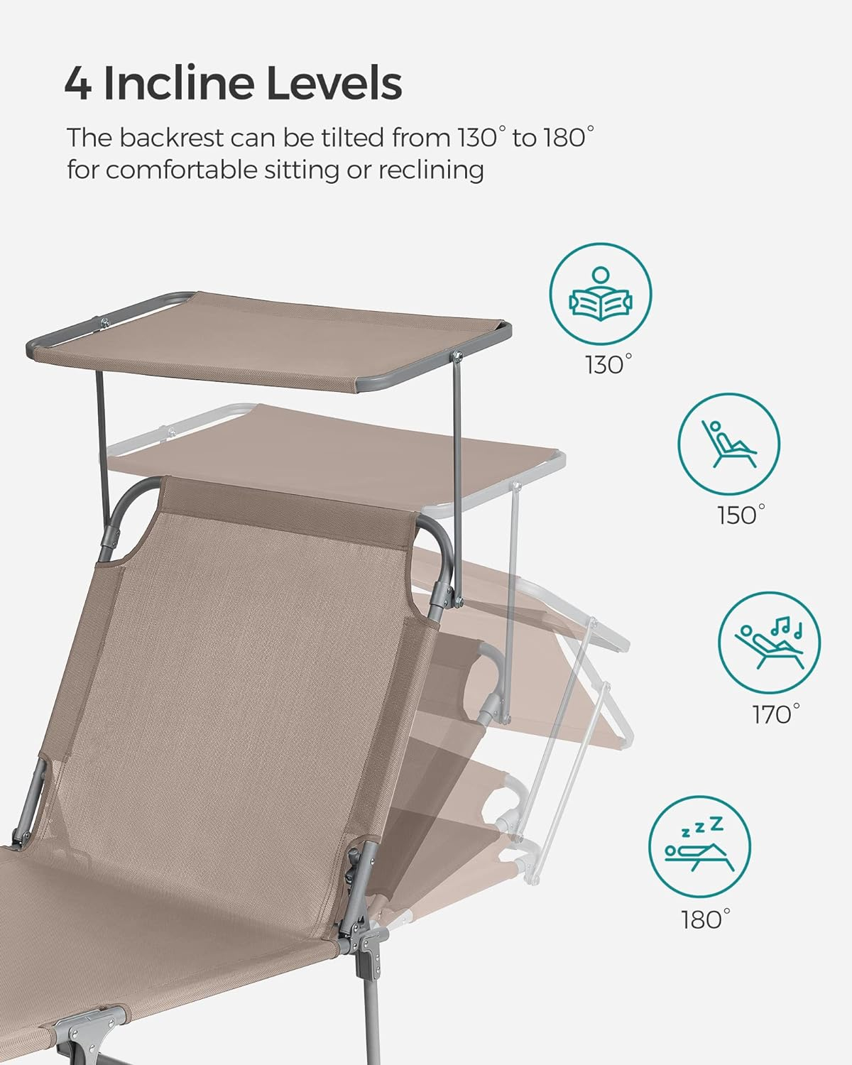 Specificatii: Culoare: Crem Material: Otel, tesatura sintetica Dimensiune produs: 193 x 53 x 29 cm Dimensiune pliata: 17 x 53 x 73 cm Greutate produs: 7,1 kg Max. Capacitate de sarcina statica: 150 kg Despre acest articol Atunci cand este pliat, acest sezlong masoara doar 17 x 53 x 73 cm, ceea ce il face convenabil de adus la piscina sau pe terasa. Cele doua manere il fac usor de transportat.Acest sezlong are un spatar reglabil cu 4 pozitii de inclinare si o tetiera detasabila. Pur si simplu reglati-l in pozitia preferata.Acest sezlong, cu o tesatura sintetica respirabila, impiedica umezeala sa se ataseaze de scaun. Relaxati-va in voie, chiar si in timpul celor mai fierbinti zile de vara. Acest sezlong are o umbrela de soare, care va permite sa cititi reviste in curte in timp ce va bucurati de soare. Puteti regla cu usurinta unghiul parasolarului cu mana, fara a fi nevoie sa va ridicati.Acest sezlong solid, cu cadrul sau din otel acoperit cu pulbere si articulatiile intarite, poate sustine pana la 150 kg si ramane stabil datorita picioarelor antiderapante.