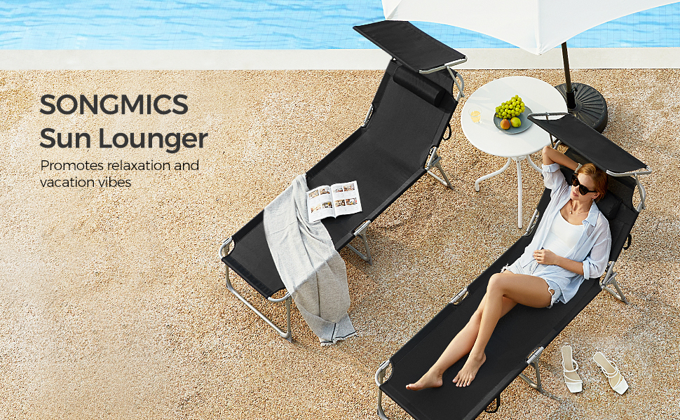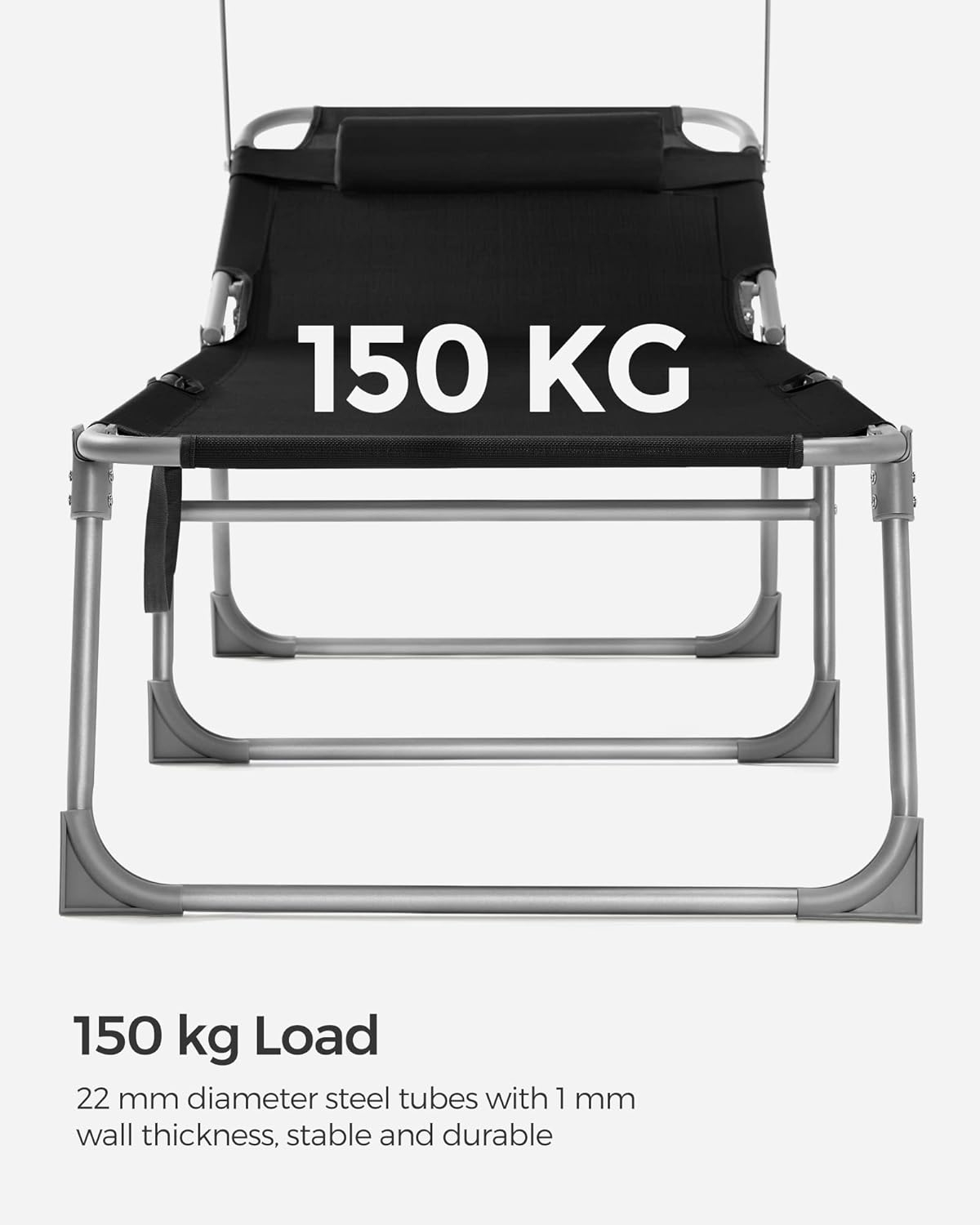 Specificatii: Culoare: Negru Material: Otel, tesatura sintetica Dimensiunea produsului: 193 x 53 x 29 cm Dimensiune pliat: 17 x 53 x 73 cm Greutatea produsului: 7,1 kg Max. Capacitate de incarcare statica: 150 kg Despre acest articol Atunci cand este pliat, acest sezlong masoara doar 17 x 53 x 73 cm, ceea ce il face convenabil de adus la piscina sau pe terasa. Cele doua manere il fac usor de transportat.Acest sezlong are un spatar reglabil cu 4 pozitii de inclinare si o tetiera detasabila. Pur si simplu reglati-l in pozitia preferata.Acest sezlong, cu o tesatura sintetica respirabila, impiedica umezeala sa se ataseaze de scaun. Relaxati-va in voie, chiar si in timpul celor mai fierbinti zile de vara. Acest sezlong are o umbrela de soare, care va permite sa cititi reviste in curte in timp ce va bucurati de soare. Puteti regla cu usurinta unghiul parasolarului cu mana, fara a fi nevoie sa va ridicati.Acest sezlong solid, cu cadrul sau din otel acoperit cu pulbere si articulatiile intarite, poate sustine pana la 150 kg si ramane stabil datorita picioarelor antiderapante.
