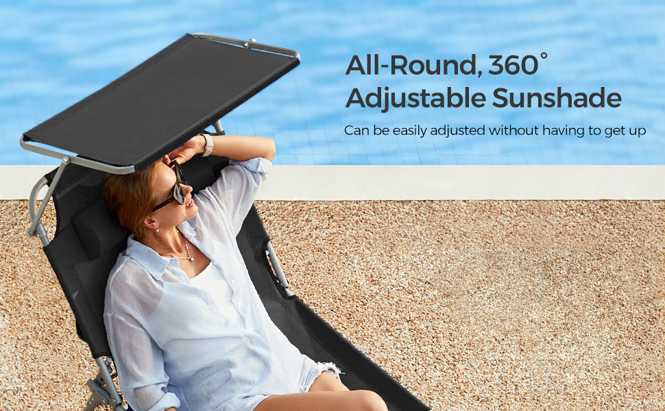 Brius Sezlong pliabil cu parasolar si tetiera, spatar reglabil 4 pozitii, tesatura sintetica respirabila, max 150 kg, 193x53x29 cm, negru