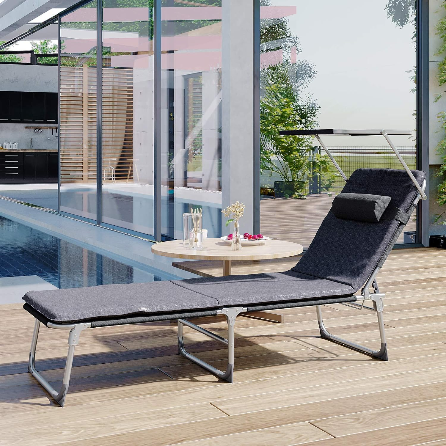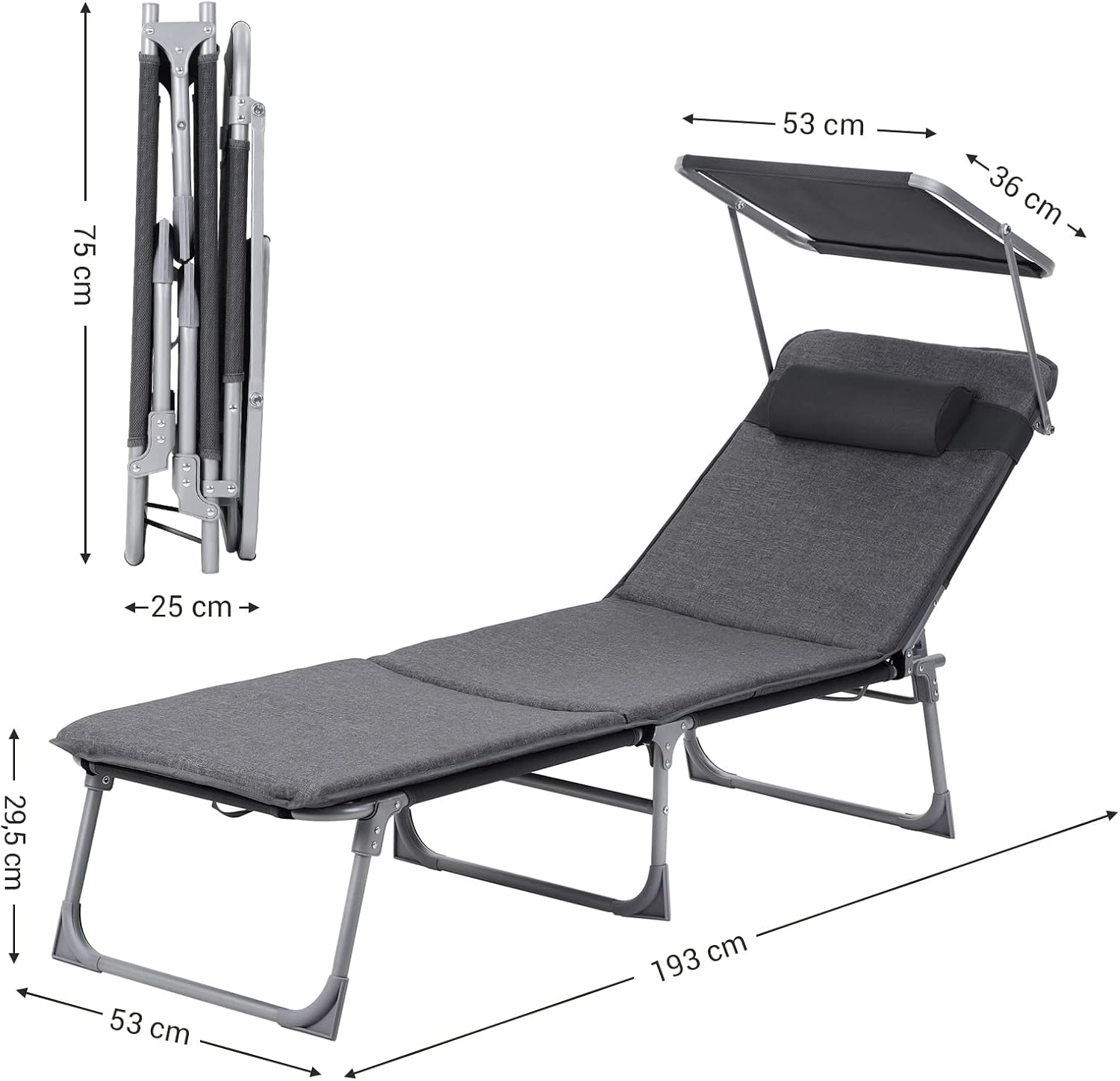 Sezlong pliabil cu saltea 3 cm si parasolar, spatar reglabil 4 pozitii, max 150 kg, 193x53x30 cm, gri