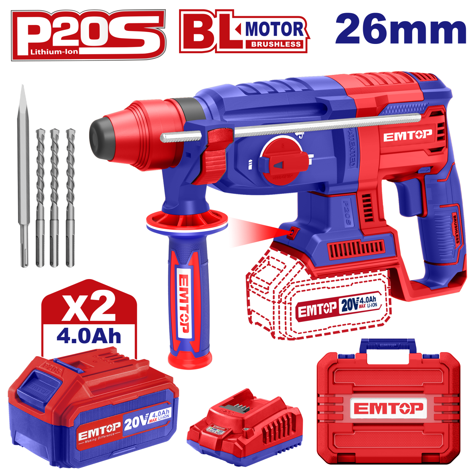 Ciocan rotopercutor cu 2 acumulator 4.0Ah, 22mm, motor fara perii (brushless), cutie de transport - ELRH202287, EMTOP