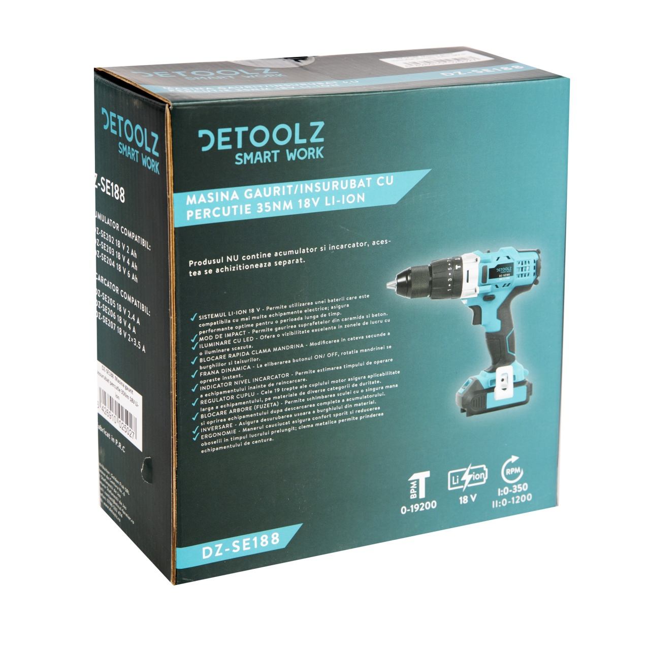 Masina de gaurit si insurubat cu percutie, 35Nm, 18V Li-ion, Detoolz DZ-SE188 este un produs robust, eficient si usor de utilizat pentru gaurire si percutie in caramida, beton sau lemn dar si pentru slabirea sau strange-rea suruburilor.