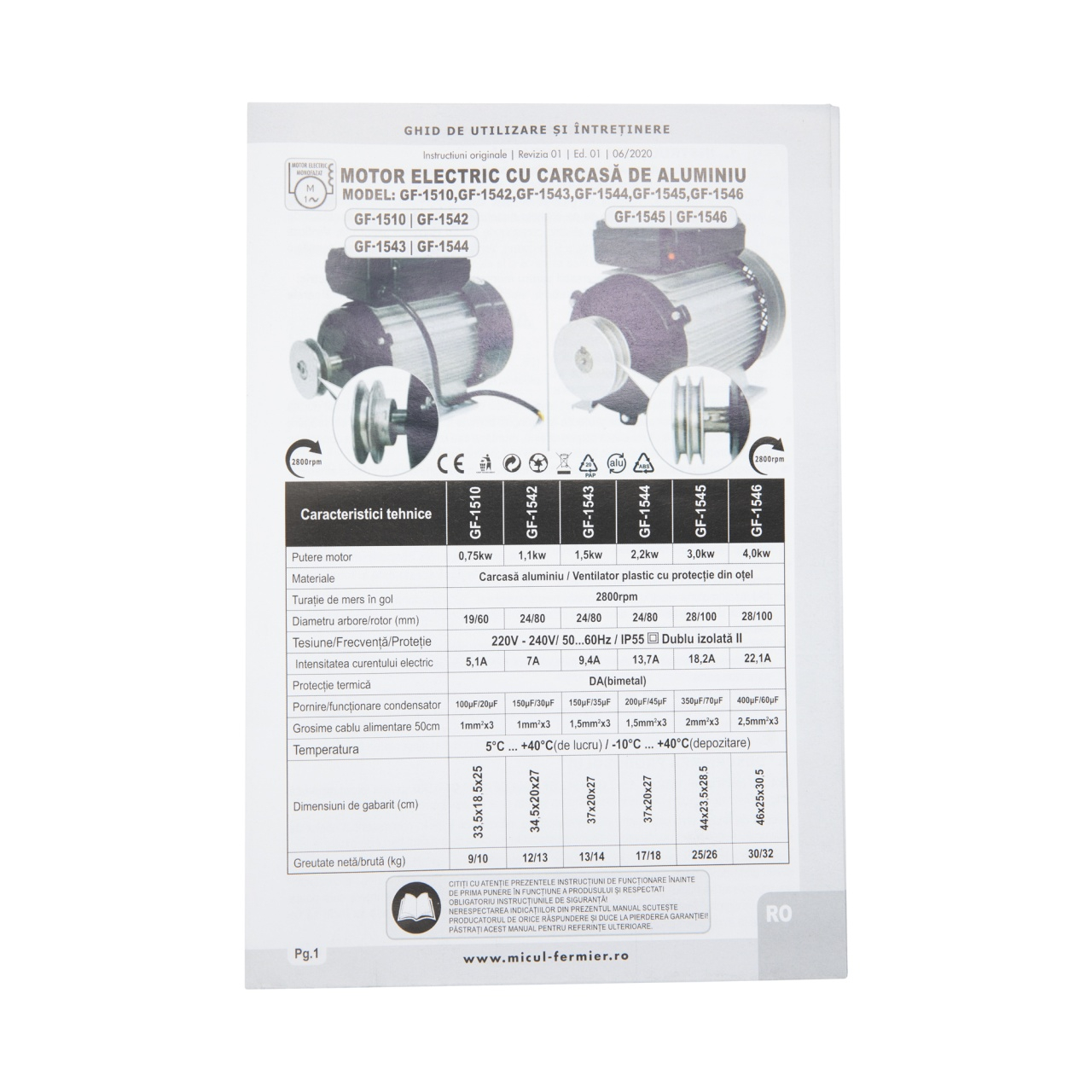 Motorul electric 2800 rpm, 0.75Kw cu carcasa de aluminiu, Micul Fermier GF-1510 este compus din: