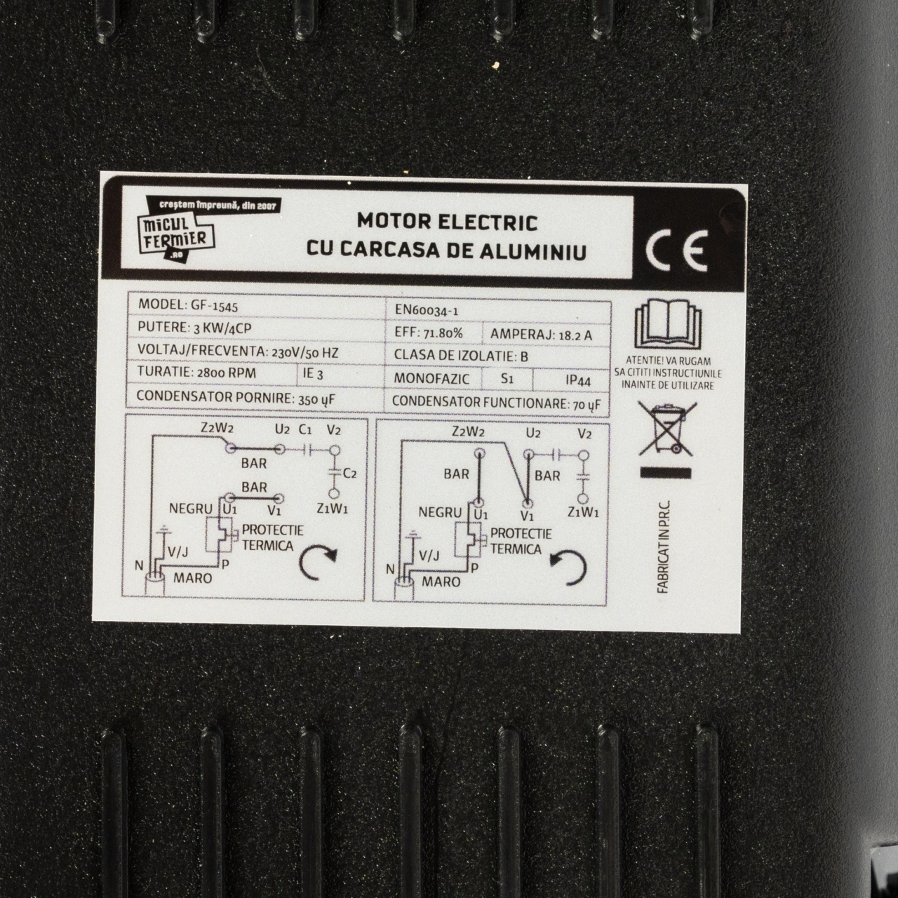 Motor electric 2800RPM, 3KW, cu carcasa de aluminiu, Micul Fermier GF-1545 nu este folosit niciodata singur. Un motor electric trebuie integrat intr-un sistem care necesita energie mecanica. Directia de rotatie standard pentru motoare electrice monofazice este in contra-sensul acelor de ceasornic.