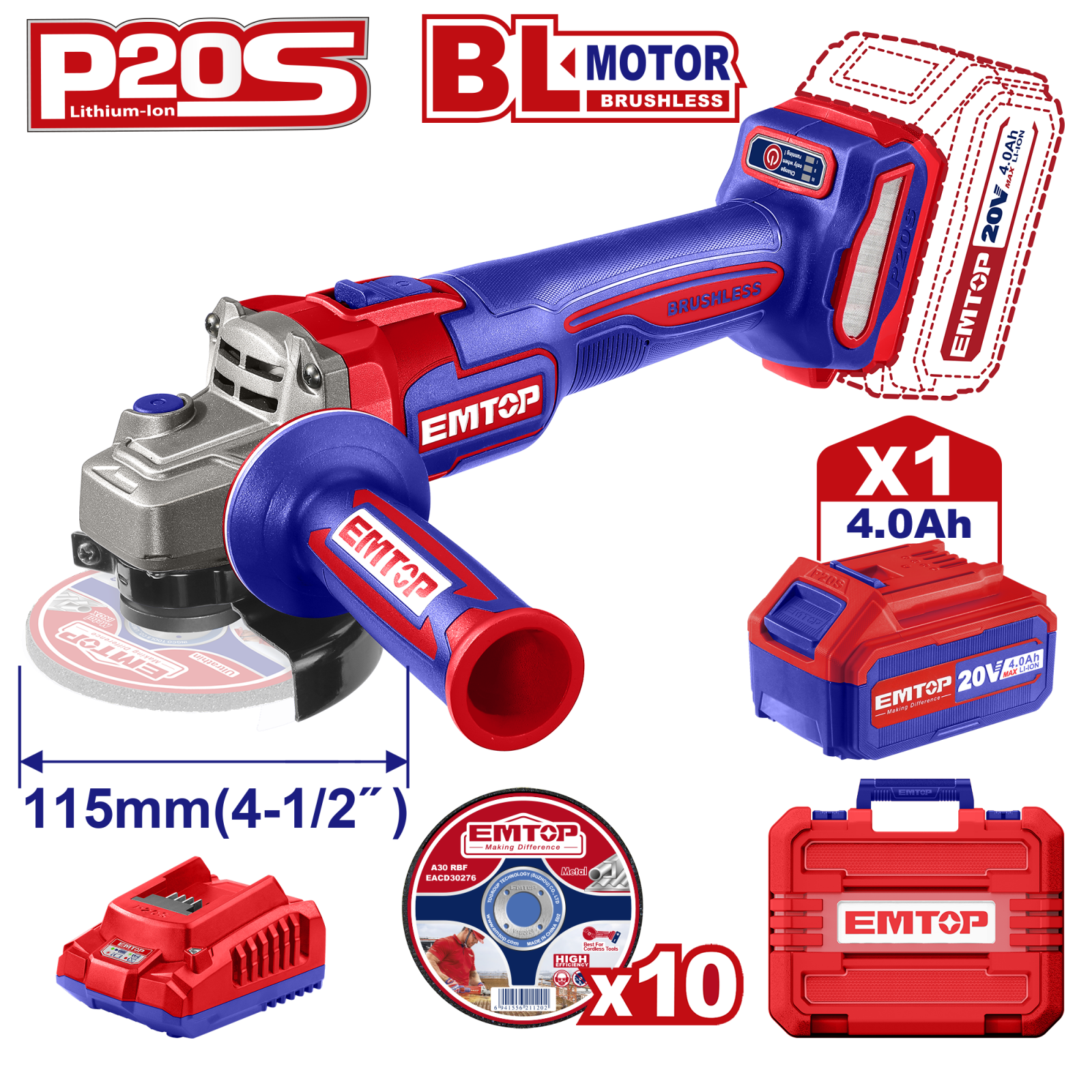 Polizor unghiular cu 1 acumulator 4.0Ah, motor fara perii (brushless), 115mm, 10 discuri incluse - ELAG211541, EMTOP