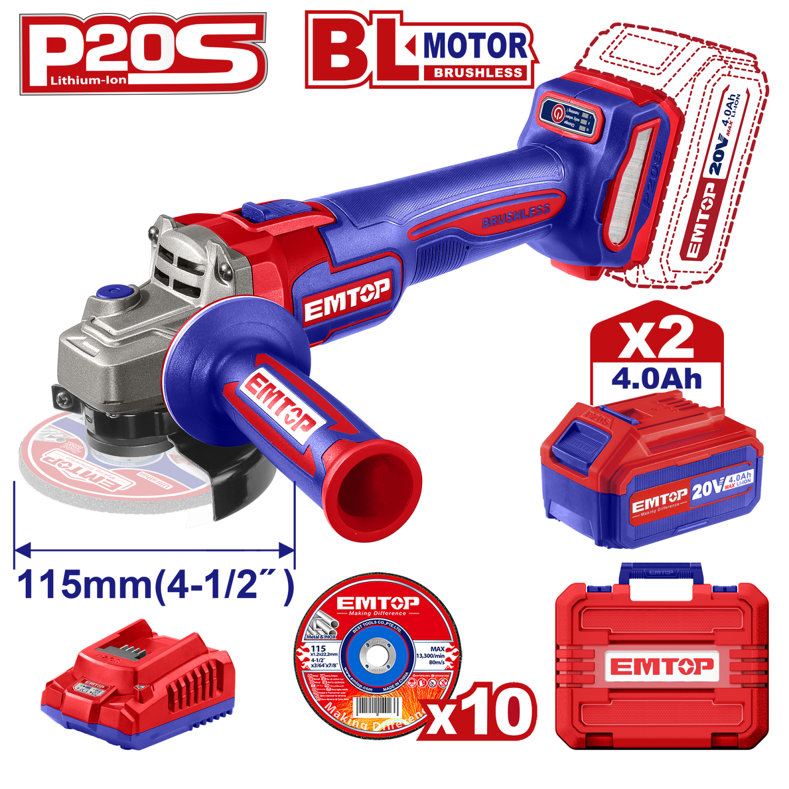 Polizor unghiular cu 2 acumulatori 4.0Ah, motor fara perii (brushless), 115mm, 10 discuri incluse - ELAG211542, EMTOP