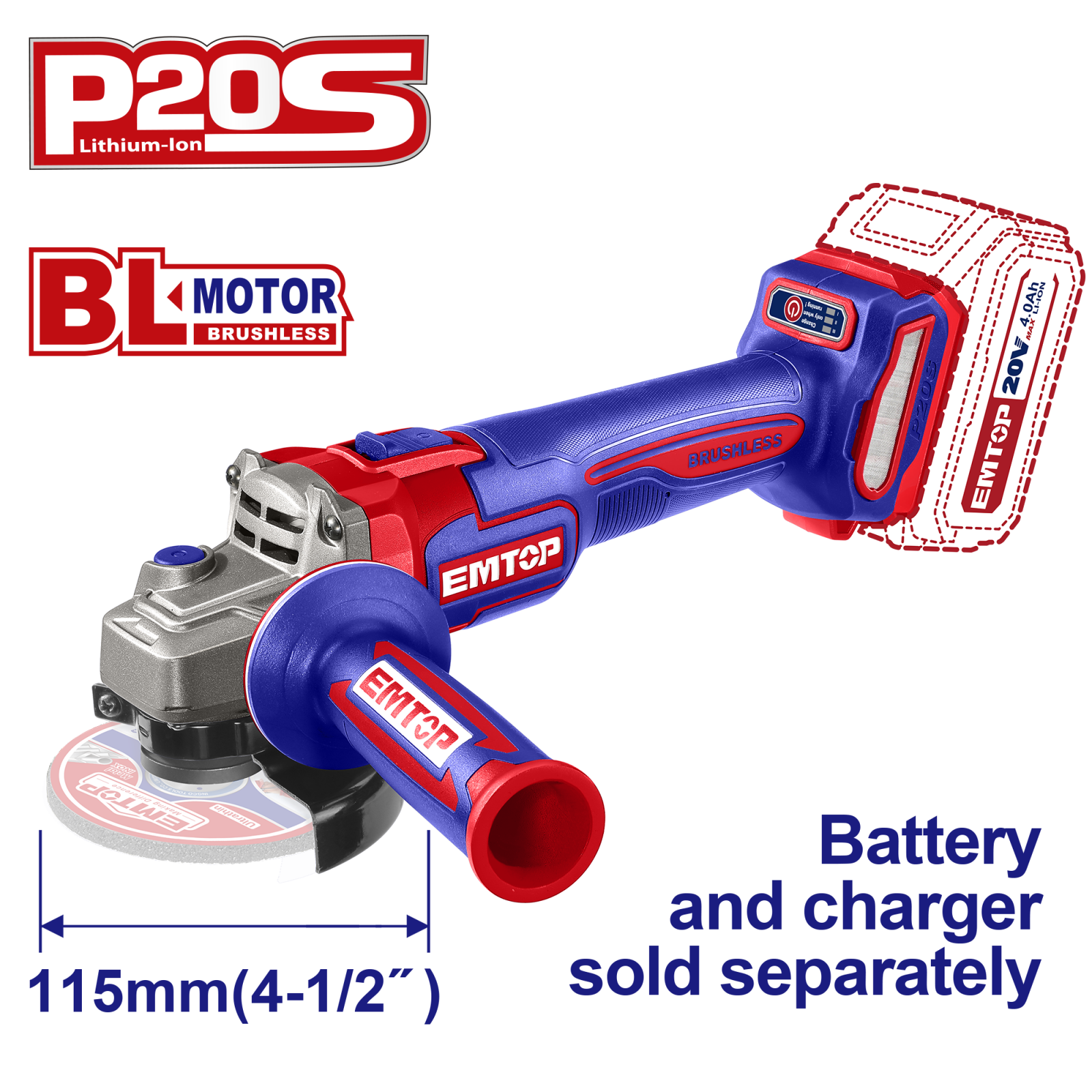 Polizor unghiular fara acumulator si incarcator, motor fara perii (brushless), 115mm - ELAG21154, EMTOP