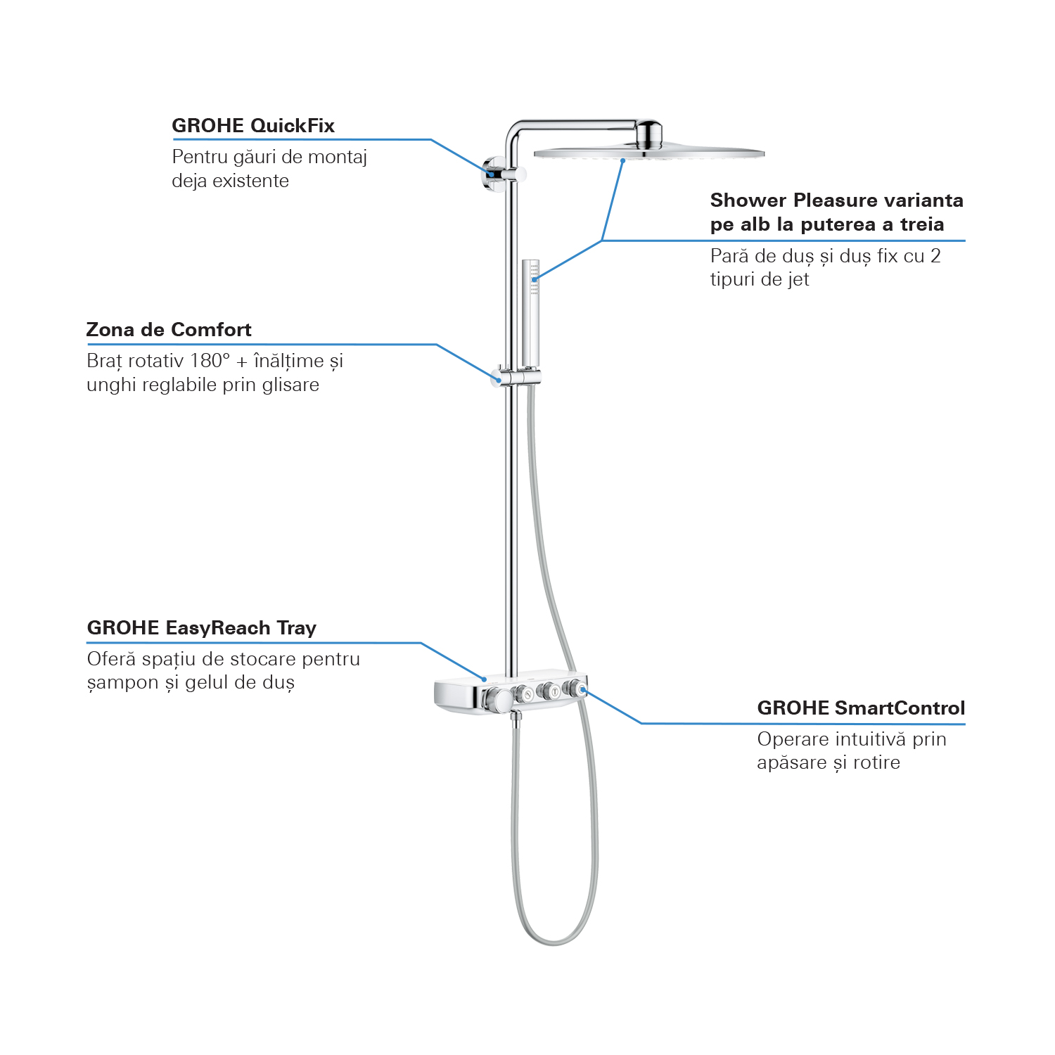 Fiecare aspect al Euphoria SmartControl 310 este proiectat pentru o ușurință în folosire - suportul culisant face ușoară reglarea înălțimii perei de duș , iar bara de duș cu QuickFix se poate instala ușor folosind găurile existente.