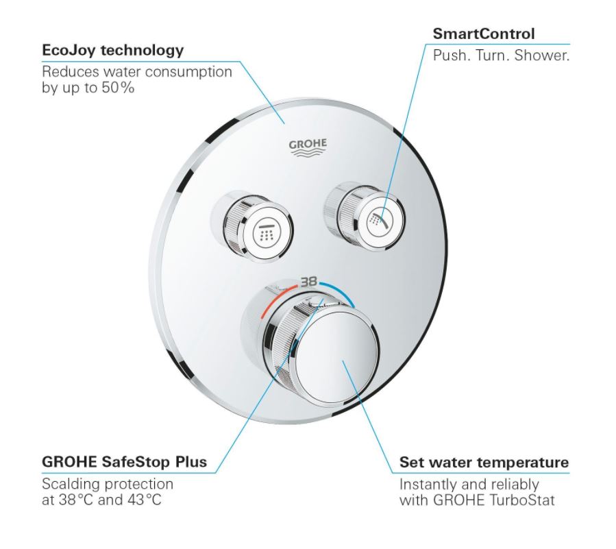 Inovativa tehnologie SmartControl vă permite să selectați sursa de pulverizare dorită și să reglați debitul apei prin simpla apăsare/rotire a unui buton. Cele două valve vă permit să combinați dușul fix și dușul de mână sau să comutați cu ușurință între acestea sau între duș și cadă. Tehnologia integrată GROHE TurboStat împiedică apariția neplăcutelor fluctuații de temperatură.