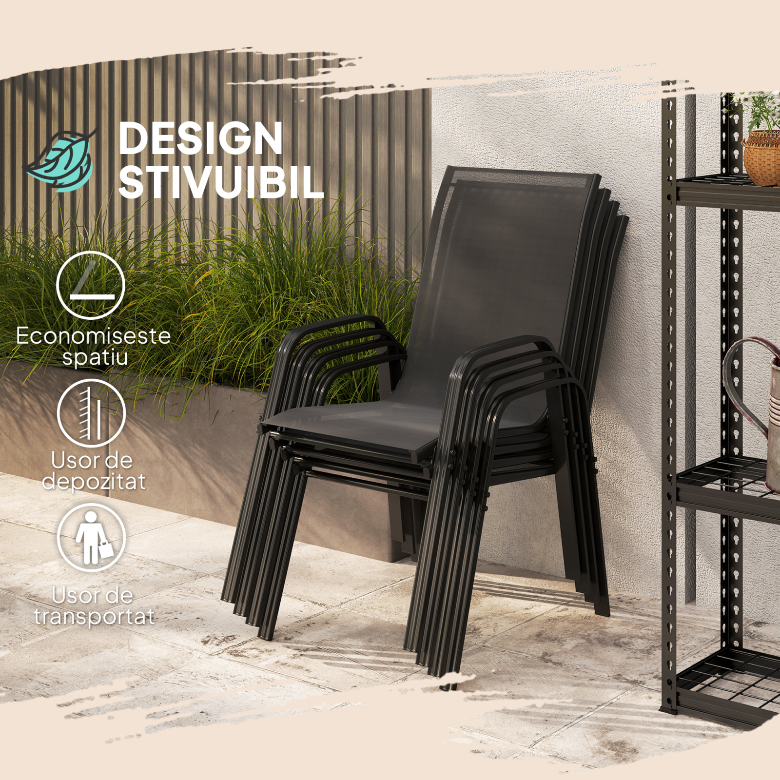 Bucura-te de momente relaxante in aer liber alaturi de setul de 4 scaune de gradina [BRAND NAME]. Realizate cu un cadru solid din metal si un sezut din tesatura de plasa, aceste scaune pentru exterior sunt confortabile si respirabile, perfecte pentru zilele calde de vara. Designul suprapozabil permite depozitarea scaunelor cu un spatiu minim ocupat atunci cand nu sunt utilizate, maximizand spatiul disponibil.